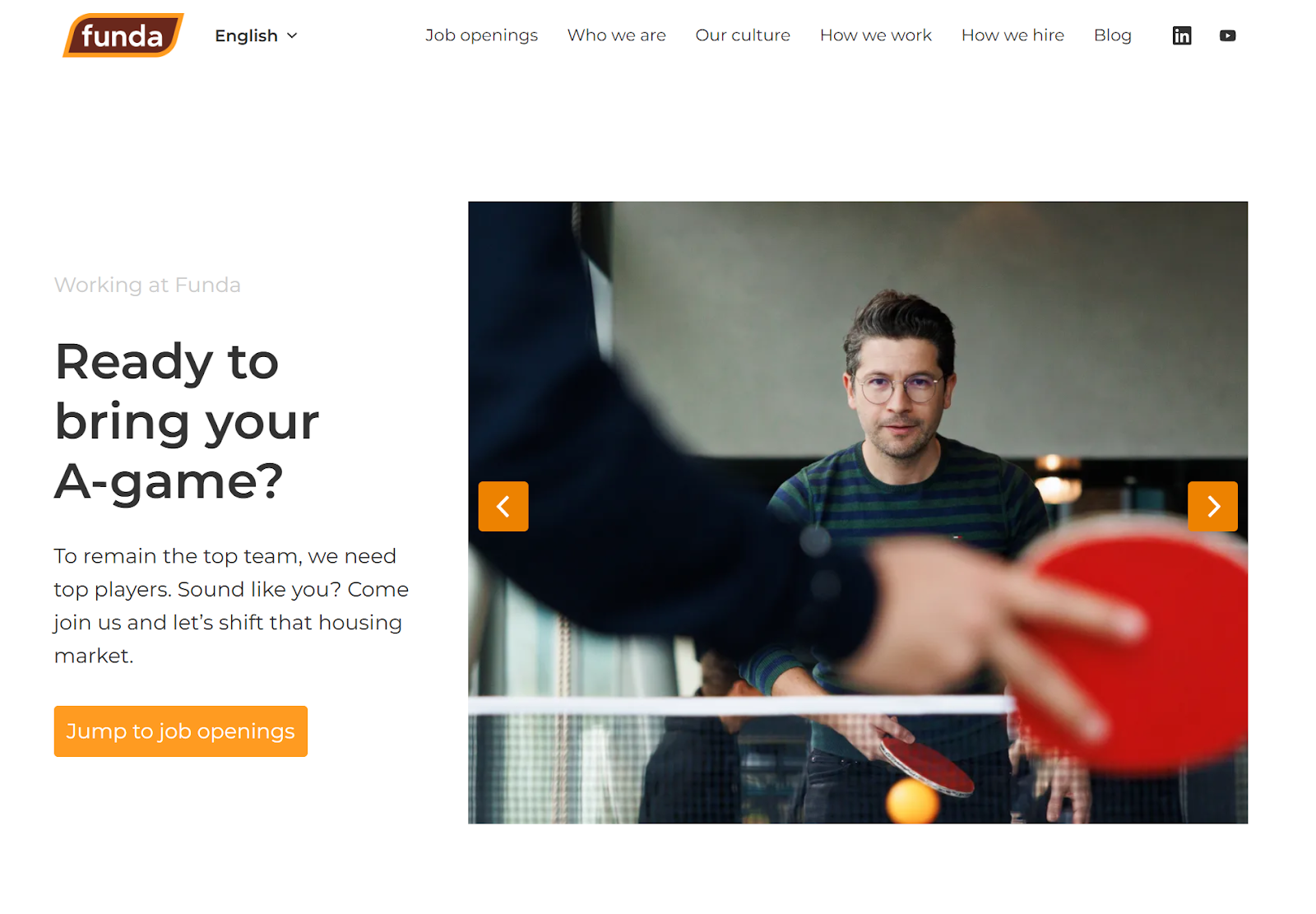 We love the simplicity and honesty of Funda’s careers page—especially the clear Employer Value Proposition (EVP) above the fold: “Ready to bring your A-game?” It immediately sets the tone, and sets a challenge for the visitor out of the gate.