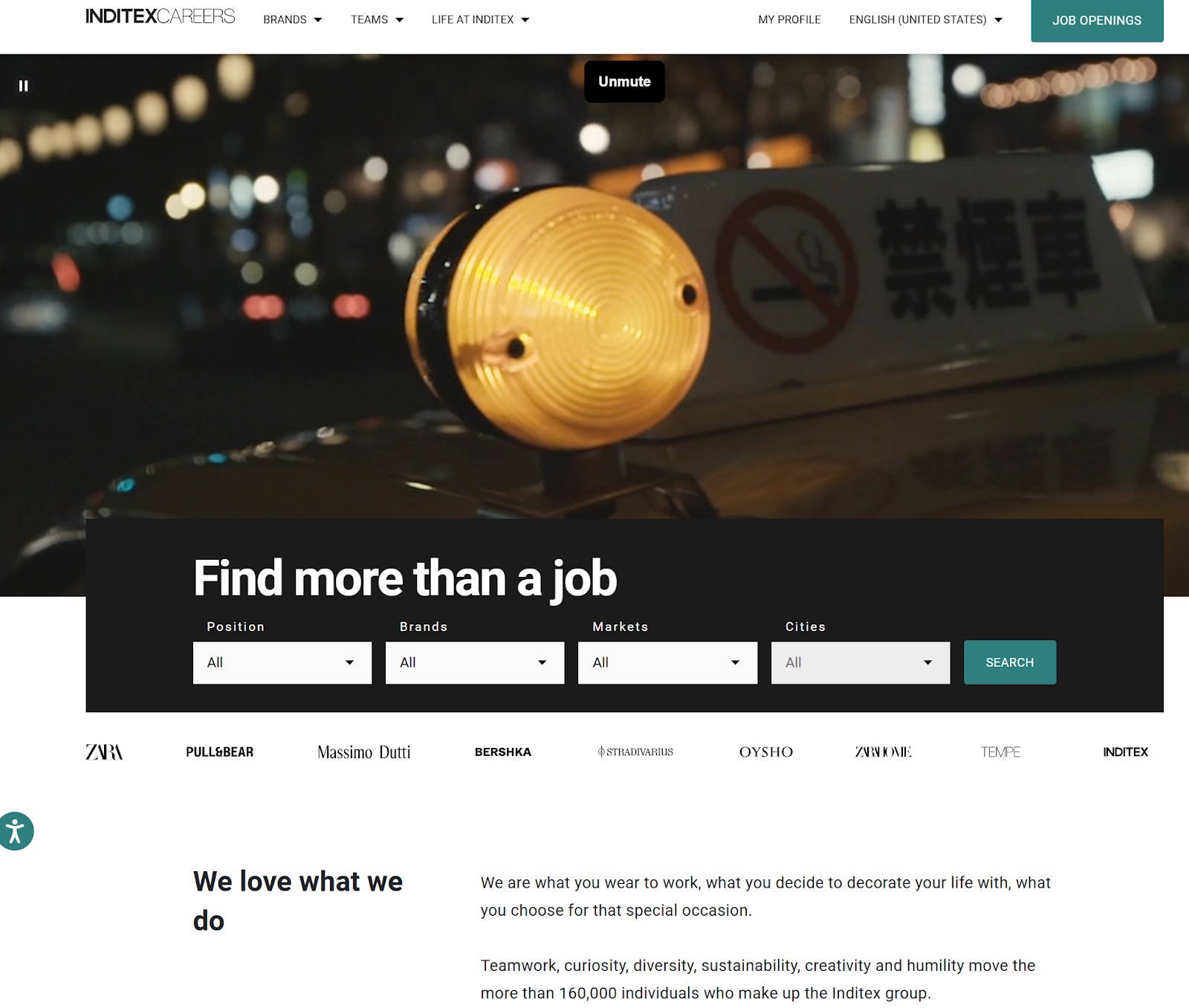 We love how Inditex (the group behind Zara and other global brands) brings their scale to life on their careers page without losing a sense of humanity. The headline “We love what we do” paired with a high-quality video immediately draws you in. You see employees not just at work but also in everyday life, which creates a powerful and authentic story about the culture behind the brand.