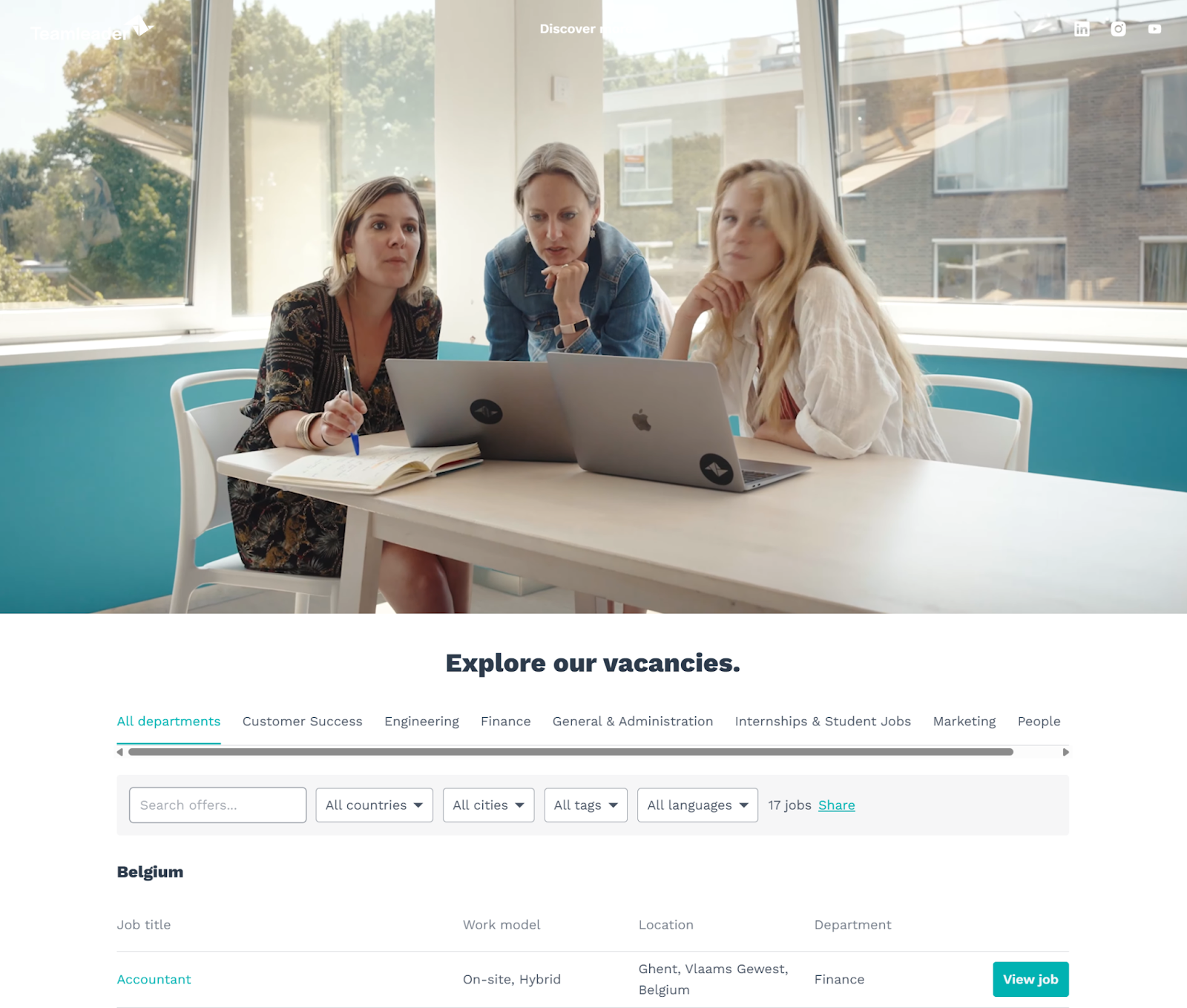 Teamleader takes a different approach to the careers pages so far, choosing to use a fun hero video to showcase their brand. Immediately below that is a robust job vacancies section, with extensive filtering by department, country, cities, and language.