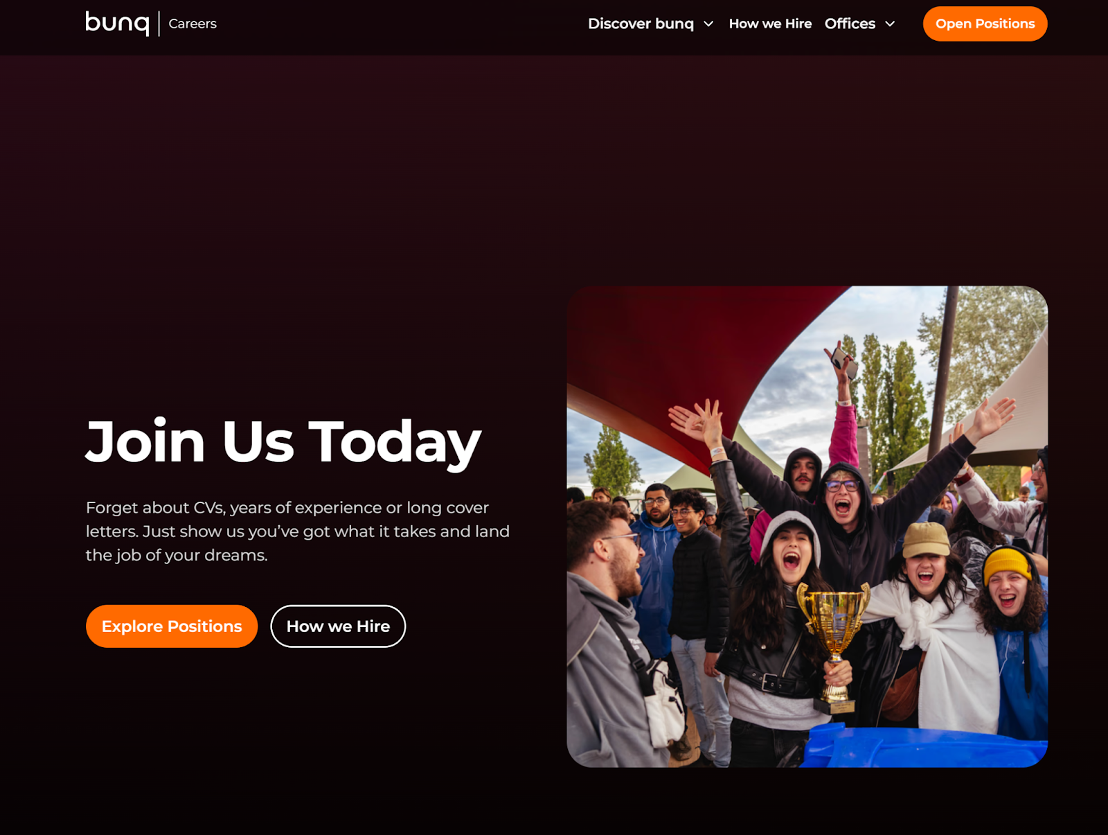 bunq makes quite the first impression on their careers page. It doesn’t tiptoe around formality, but instead gets right to the point with this statement: