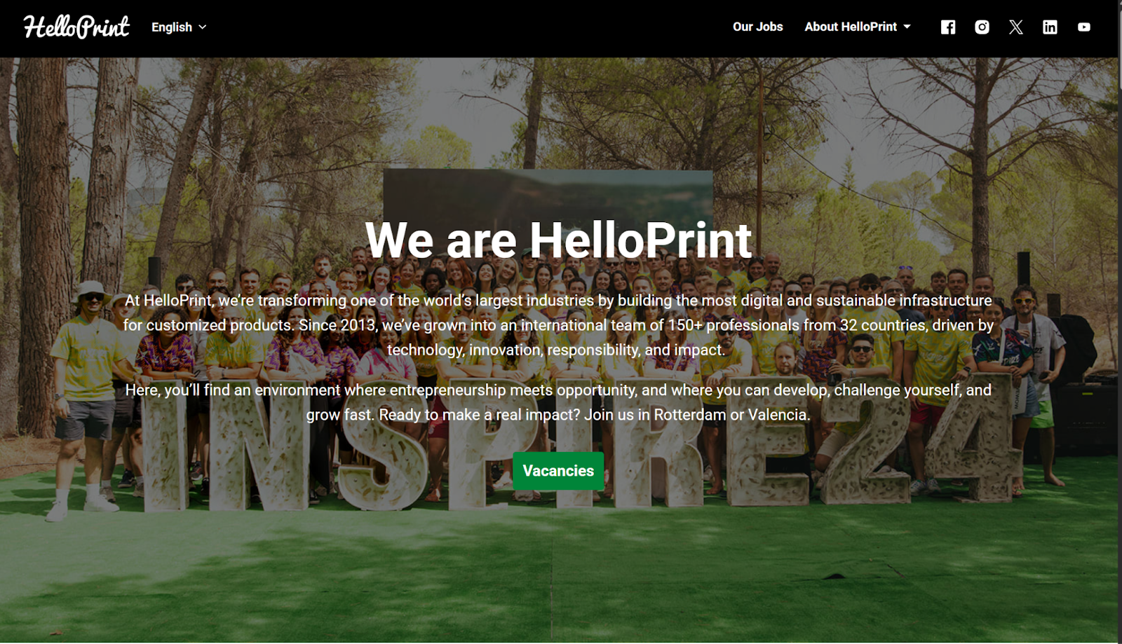 HelloPrint’s careers page is built around purpose. From the start, they highlight their B-Corp certification and mission to create a “digital and sustainable infrastructure for customized products.” That focus on impact makes the page instantly appealing to candidates who want their work to align with their values.