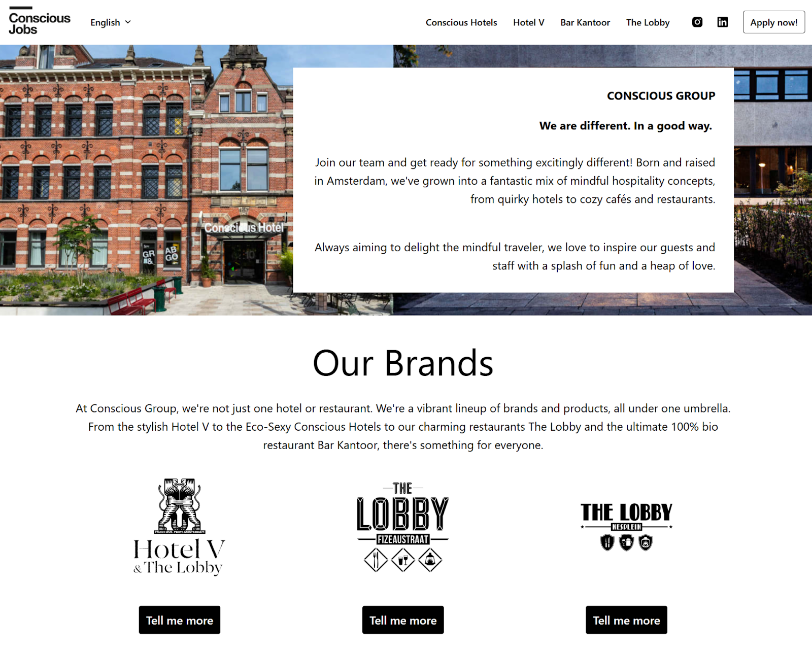 Conscious Hotel is a shining example of how a brand with multiple locations and sub-companies can use a careers page to showcase a unified culture across brands. They lead with a clear message about who they are and where they come from as a company, and then showcase their brands with jumping off links for candidates who are interested in specific locations.