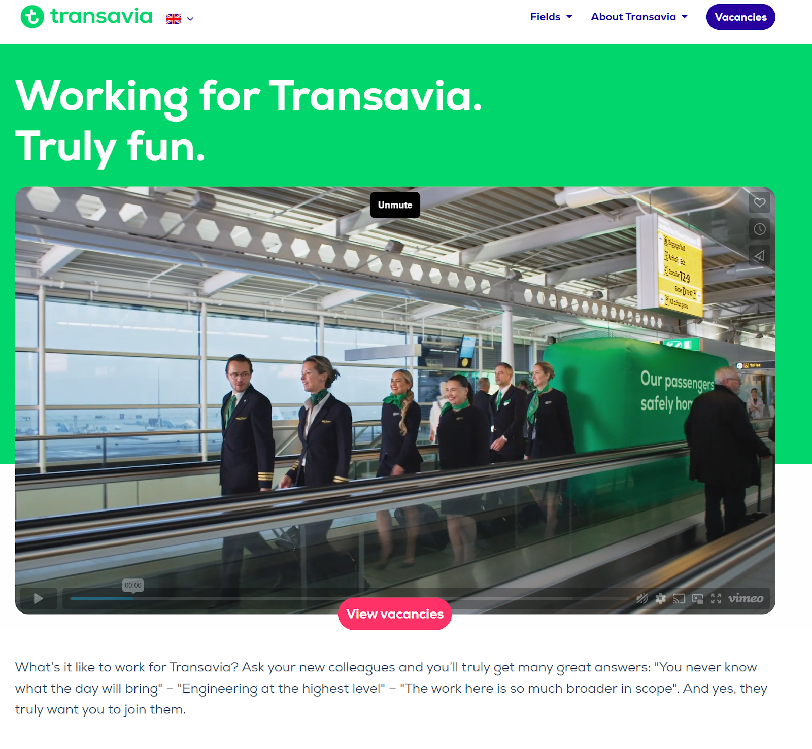 Transavia’s careers page is a masterclass in authentic brand storytelling, from their hero message to their employer video, and all the way down to their company history section.