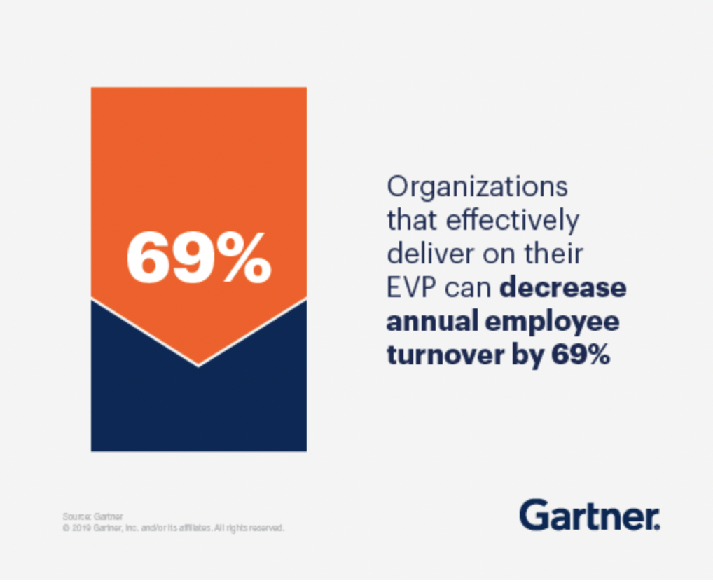 As well as this, having an engaged employee pool means that you're less likely to have to run recruitment processes regularly. According to Gartner, having a strong employee value proposition decreases annual employee turnover by 69%.