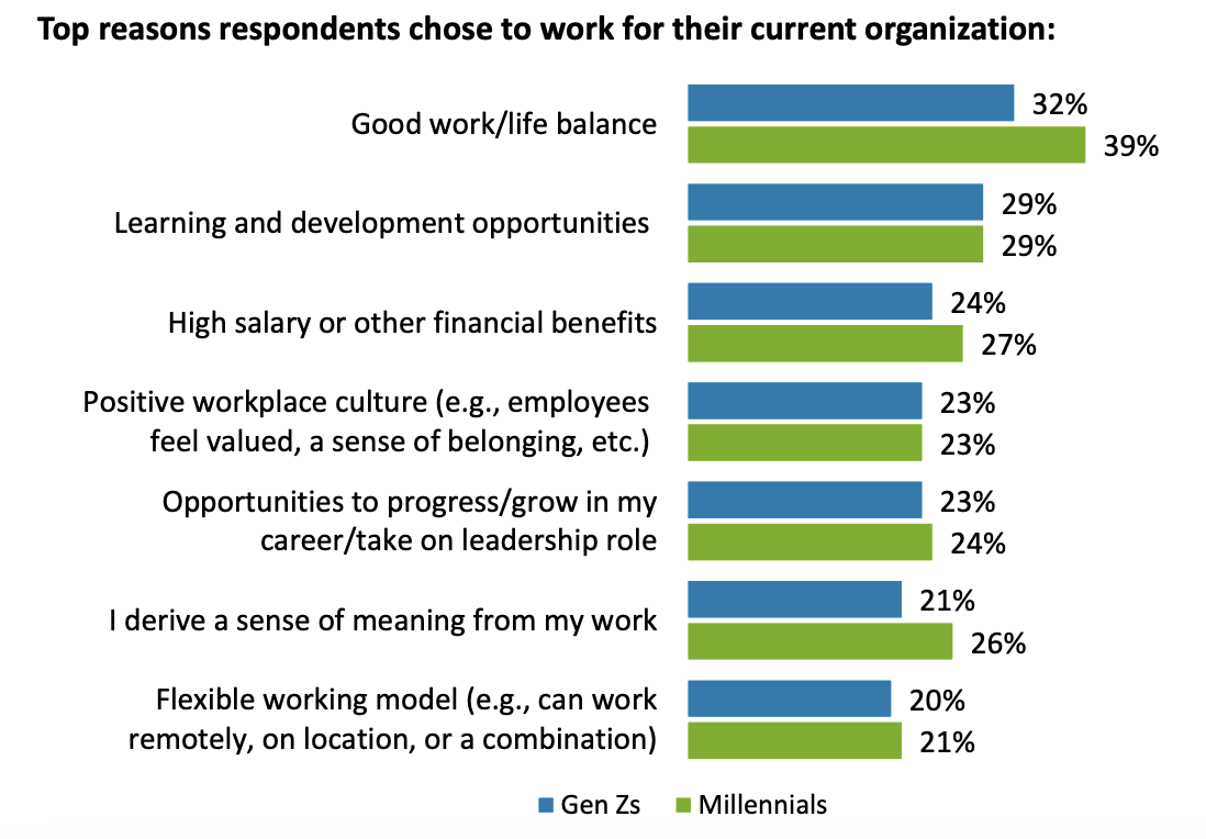- 29% of young workers chose to work for their current organization because it offered learning and development opportunities. And;