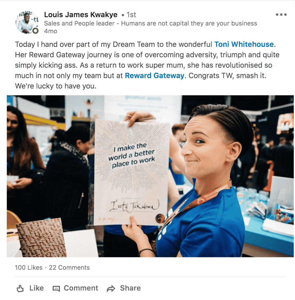 Broadcast employee recognition moments on your social media accounts like LinkedIn. Make a post highlighting the experiences of new hires.