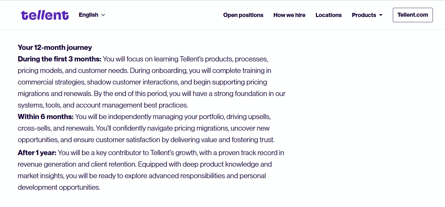 Tellent picked up on what candidates were asking for: crystal-clear information about the job. Our job postings now outline what new hires can expect in their first three months, after six months, and after a year. This gives a realistic picture of how the role develops over time, while also building confidence and trust.