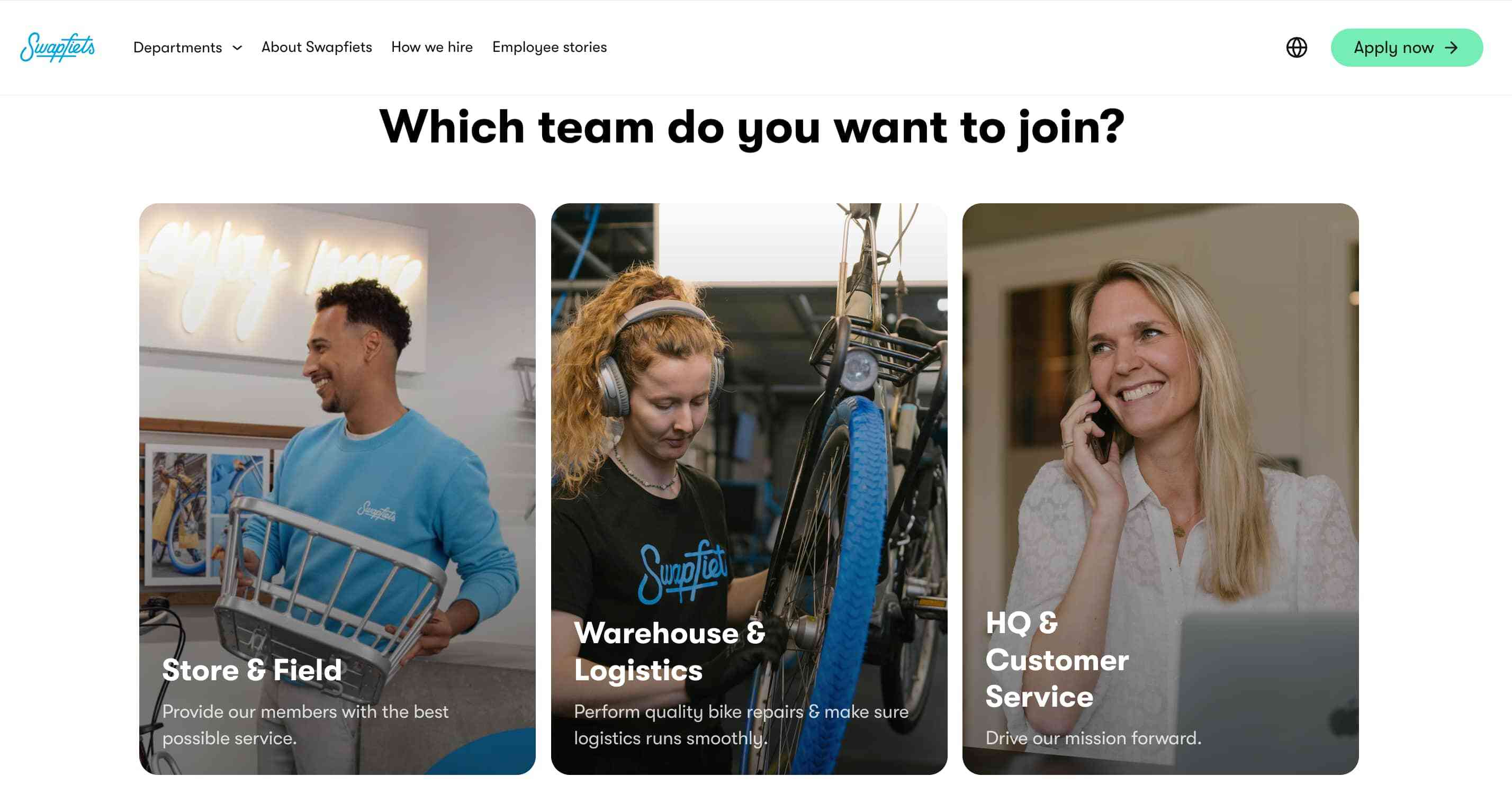 Swapfiets, the subscription-based bike service, has built a careers page that goes beyond job listings. Jobs are grouped by teams, making it easy for candidates to explore where they might fit best. The page also highlights the company’s mission, values, and sustainability commitments, showing applicants they’d be joining a purpose-driven brand. Authentic employee stories and vibrant visuals bring the culture to life, while clear navigation and a simple application flow remove unnecessary friction.