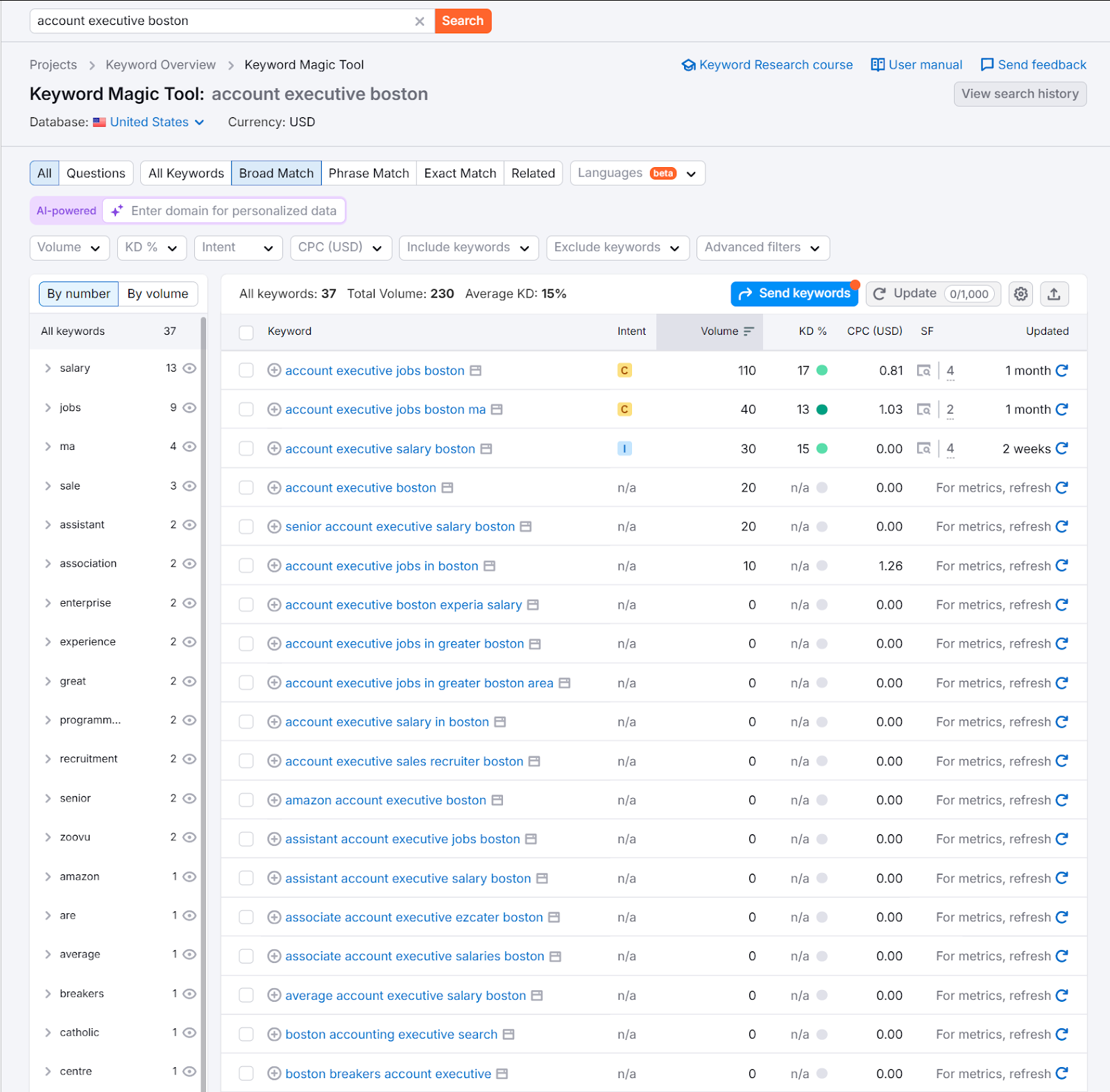 - Weighing relevance and search volume to identify the most impactful keyword targets, based on both demand and applicability to the job post
