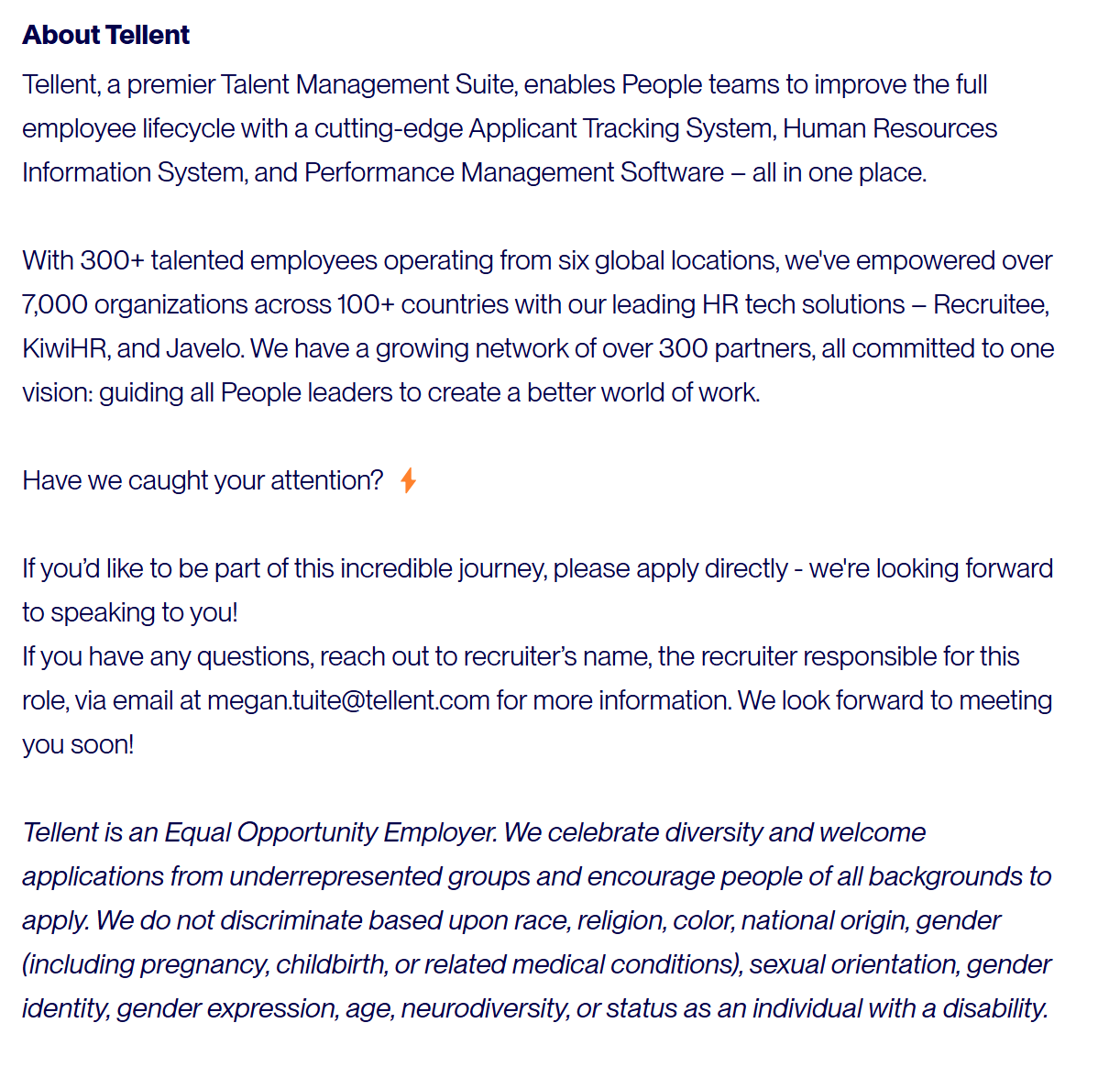 One way to add additional context within your job post that goes beyond the information related to the open position is to add detailed company information. Describe who you are as a company, what industry you operate in, what products you sell, and what you stand for as an organization.