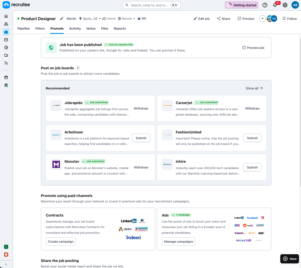 Tip: Recruitee by Tellent allows you to post to multiple job boards in just a few clicks. You can manually post to specific job boards, or create a list of priority sites that you will automatically post to for each job opening.
