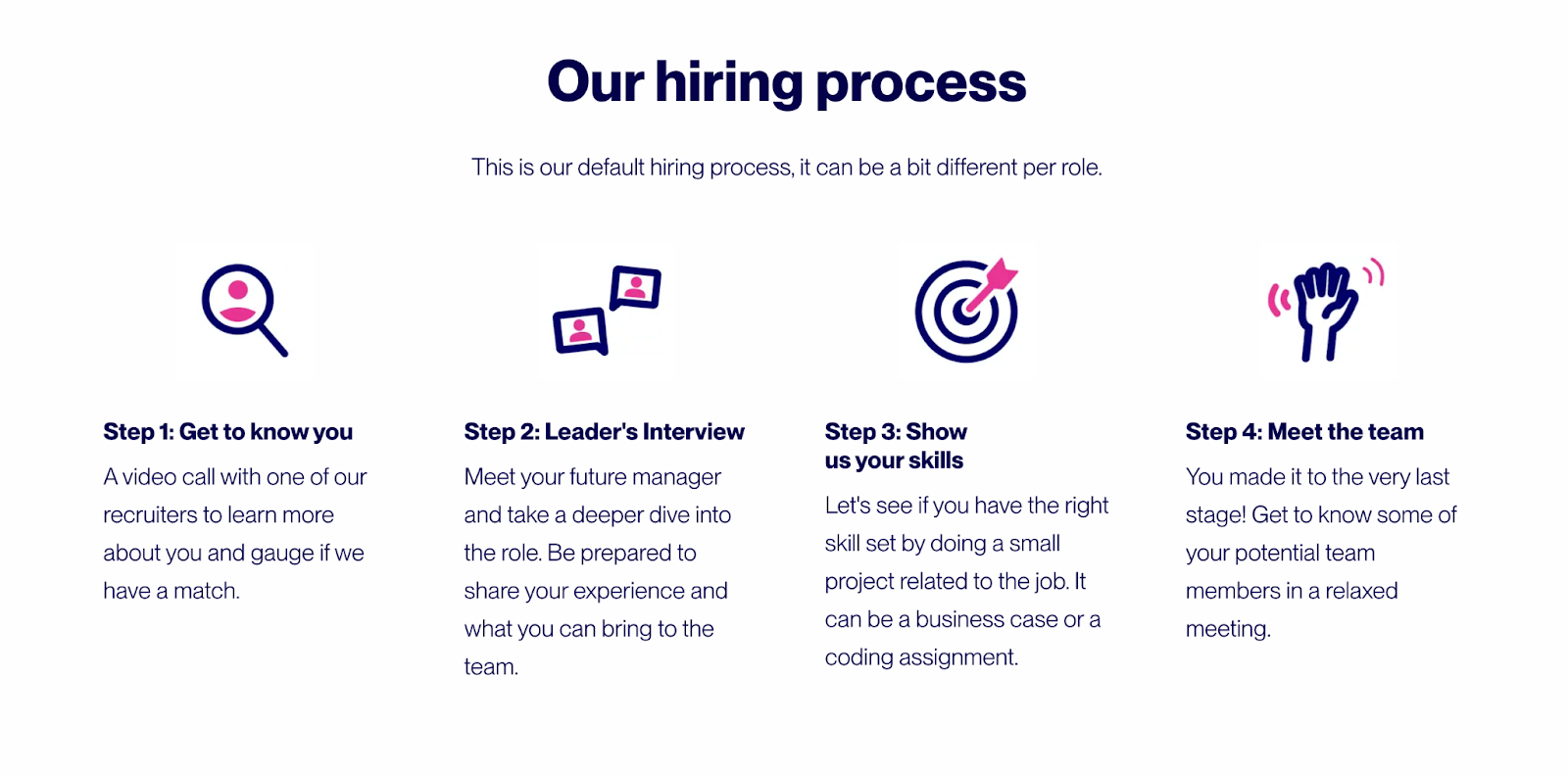 Like this Recruitee’s page, you can describe the process, answer frequently asked questions, and link back to your careers site.