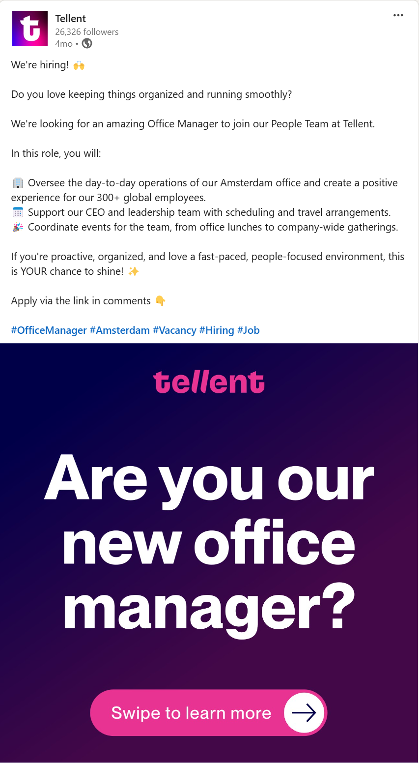 - Include visuals in your social media posts (they get way more engagement than any other types of posts). To vary the visuals, Recruitee allows you to specify different photos for each vacancy. Use this when sharing on social media to keep it consistent!