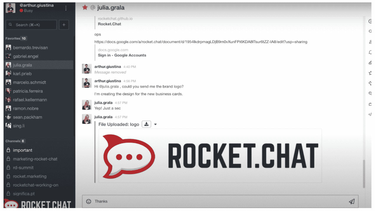 - File sharing: Teams can easily share files, documents, images, and other media types through Rocket Chat.