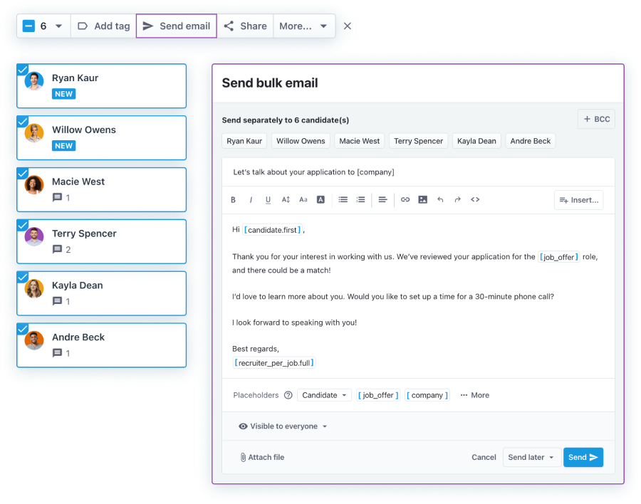 With bulk messaging, and bulk actions in general, it makes my life easier, but also improves the candidate experience because they are never left waiting on a reply or status update.
