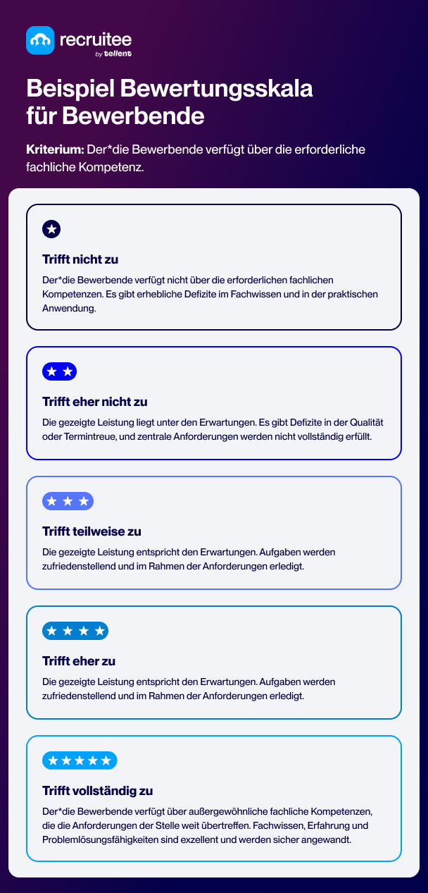 Stellen Sie allen Bewerber*innen die gleichen Fragen in der gleichen Reihenfolge und bewerten Sie sie auf der Grundlage einer standardisierten Bewertungsskala.