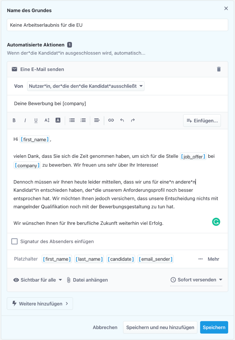 Über unser Bewerbermanagement-System können Sie Auswahlfragen und K.O.-Fragen vorab nicht nur definieren, sondern diesen auch Aktionen zuordnen. So senden Sie zum Beispiel automatische Absagen an Bewerber*innen ohne Arbeitserlaubnis oder fügen bei allen englischsprachigen Bewerber*innen automatisch eine interne Aufgaben für den zuständigen Kollegen oder die zuständige Kollegin hinzu.