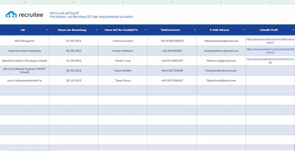 Eine Vorlage bietet Ihnen jedoch den einfachen ersten (und vor allem kostenfreien) Schritt in das digitale Management Ihres Recruitings. Die Vorlage hilft Ihnen dabei, Kandidat*innen in einer zentralen Datenbank abzuspeichern und wichtige Informationen festzuhalten.