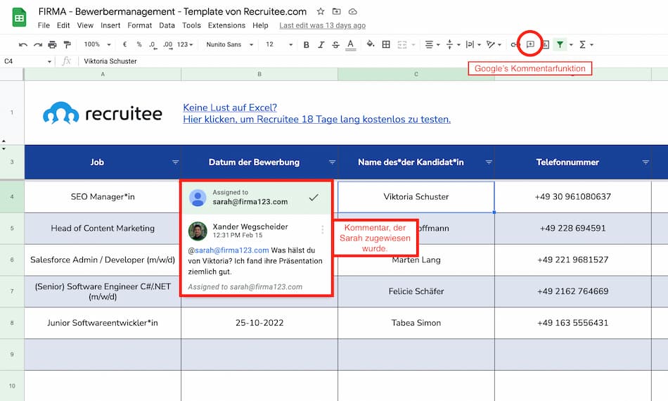 Die Excel-Vorlage bietet Ihnen nicht nur die Möglichkeit, die Übersicht zu behalten. Sie haben auch die Option, Kolleg*innen gezielt per E-Mail-Adresse zur Zusammenarbeit in der Excel-Vorlage einzuladen, sofern Sie die Cloud-Version nutzen (z. B. Office 365 oder Google Drive). Bei Recruitee nennen wir das Kollaboratives Recruiting.