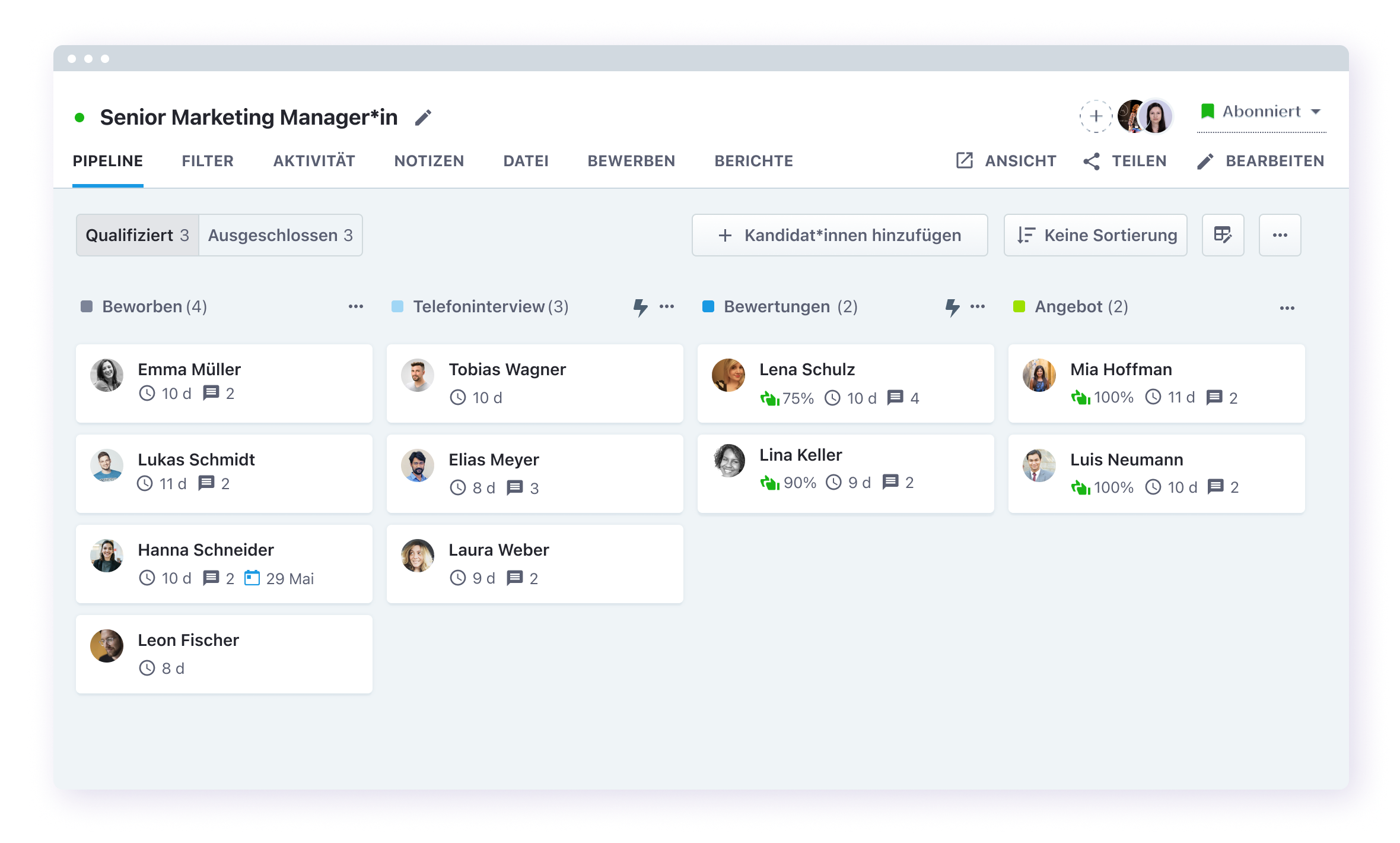 Wichtig ist dabei, den Überblick über alle laufenden Einstellungsverfahren zu behalten. Nichts ist ärgerlicher, als wenn hochqualifizierte Traumkandidat*innen abspringen, weil der Prozess schlicht zu lange dauert. Besonders in Zeiten des Fachkräftemangels kann ein ineffizienter Prozess eine Firma teuer zu stehen kommen.