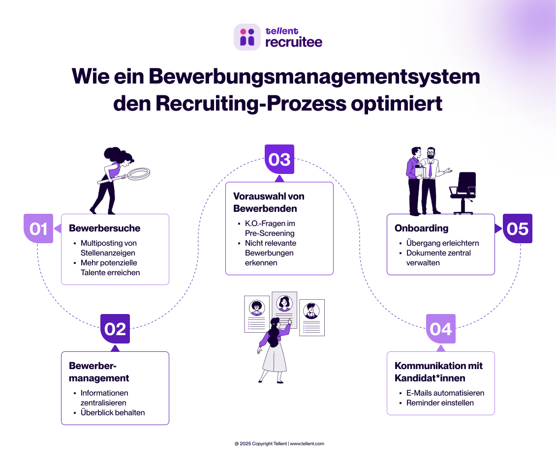 Ein Bewerbermanagementsystem (BMS) ist eine Software, mit der alle Informationen zum Recruiting-Prozess zentral gespeichert und einzelne Aufgaben automatisiert werden können (E-Mailversand, CV-Parsing, Terminverwaltung usw.). So wird der Prozess effizienter und Personalverantwortliche behalten jederzeit den Überblick.