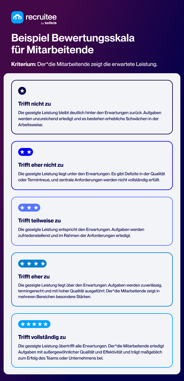 Ein Bewertungsbogen sollte eine Bewertungsskala vorgeben, um die Einschätzungen vergleichbar zu machen. Häufig wird eine mehrstufige Skala verwendet, die beispielsweise von „trifft nicht zu“ bis „trifft vollständig zu“ reicht. Aktuell gibt es keine einheitliche Bewertungsskala im Personalbereich. Manche Unternehmen setzen auf eine gerade Anzahl von Bewertungsstufen, damit sich die Bewertenden für eine positive oder negative Bewertung entscheiden müssen und nicht auf eine neutrale Mitte ausweichen können.