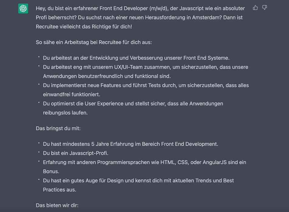 Obwohl wir ChatGPT wirklich nur ein paar Standardinformationen an die virtuelle Hand gegeben haben, kam dabei eine Stellenbeschreibung raus, die besser klingt, als viele andere Stellenbeschreibungen, die wir auf LinkedIn oder XING gesehen haben.