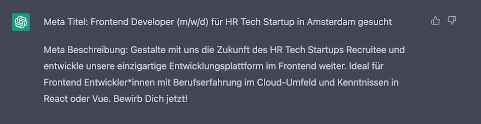 Wenn Sie eine Stellenanzeige erstellt haben wollen Sie natürlich, dass diese optimiert für Suchmaschinen ist. Dazu gehört es, dass Sie eine passende Meta Beschreibung und einen Titel definieren. Füttern Sie ChatGPT mit der Stellenbeschreibung und der Chatbot filtert alle wichtigen Informationen heraus.