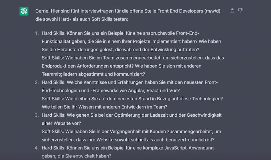 ChatGPT kann Ihnen helfen, geeignete Interviewfragen für ein Pre-Screening oder das anstehende Interview zu generieren.