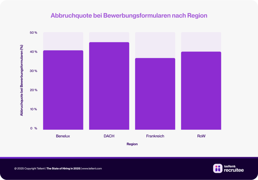 Die Abbruchquote beim Ausfüllen von Bewerbungsformularen ist durch die Bank hoch. Heißt im Klartext: Ein großer Teil der Bewerbenden, die mit dem Ausfüllen eines Bewerbungsformulars beginnen, bricht vorzeitig ab, ohne die Bewerbung zu verschicken. Am höchsten ist die Abbruchquote im DACH-Raum: Während in Frankreich rund 37 % der Kandidat*innen aus dem Formular aussteigen, sind es in Deutschland, Österreich und der Schweiz über 45 % – und damit fast die Hälfte.