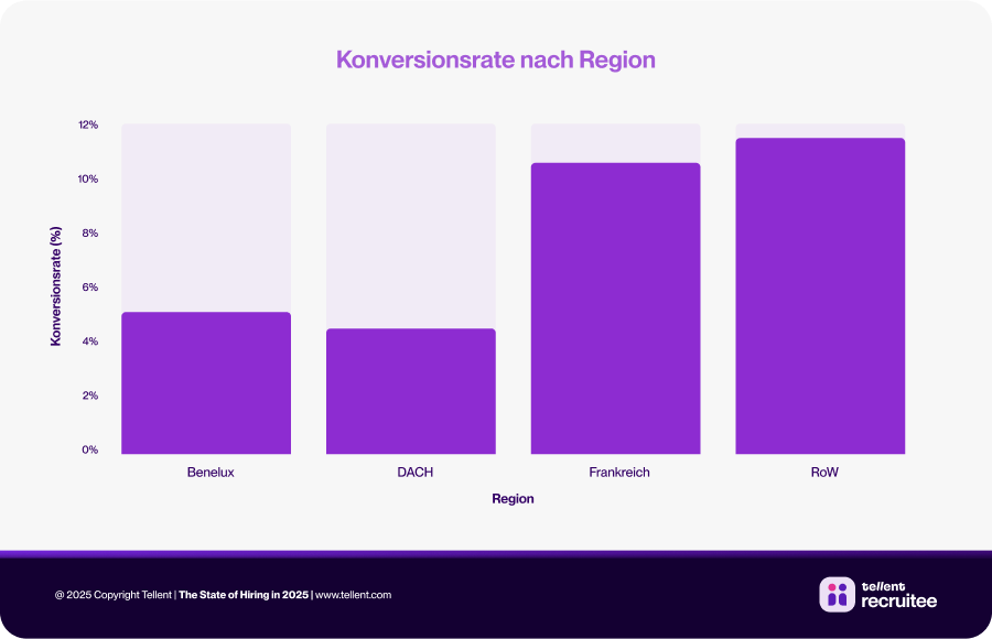 Die Konversionsrate misst den Anteil der Besuche auf den Karriereseiten, die zu einer erfolgreich eingereichten Bewerbung führen. Auch hier schneidet der DACH-Raum im internationalen Vergleich am schlechtesten ab. Während die Konversionsrate in Frankreich bei rund 10 % und im Rest der Welt sogar bei über 11 % liegt, kommen die deutschsprachigen Länder auf weniger als 5 %.