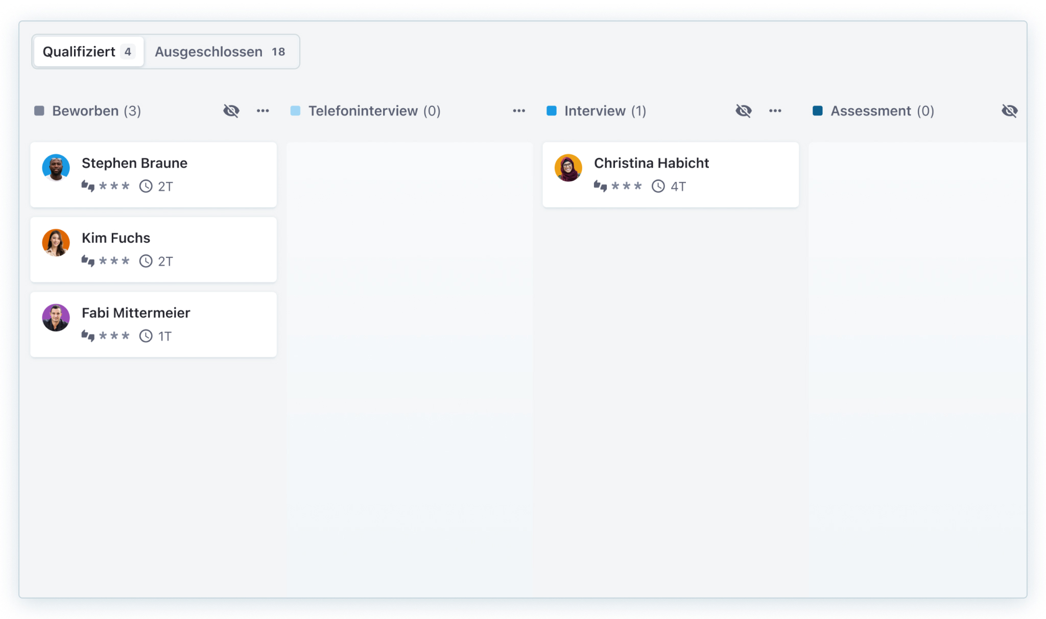 Sie können Faire Bewertungen in jeder Phase aktivieren, in der mehrere Teammitglieder Kandidat*innen gemeinsam bewerten: z.B. während der Lebenslaufprüfung, des Vorstellungsgesprächs oder der Assessmentphase.
