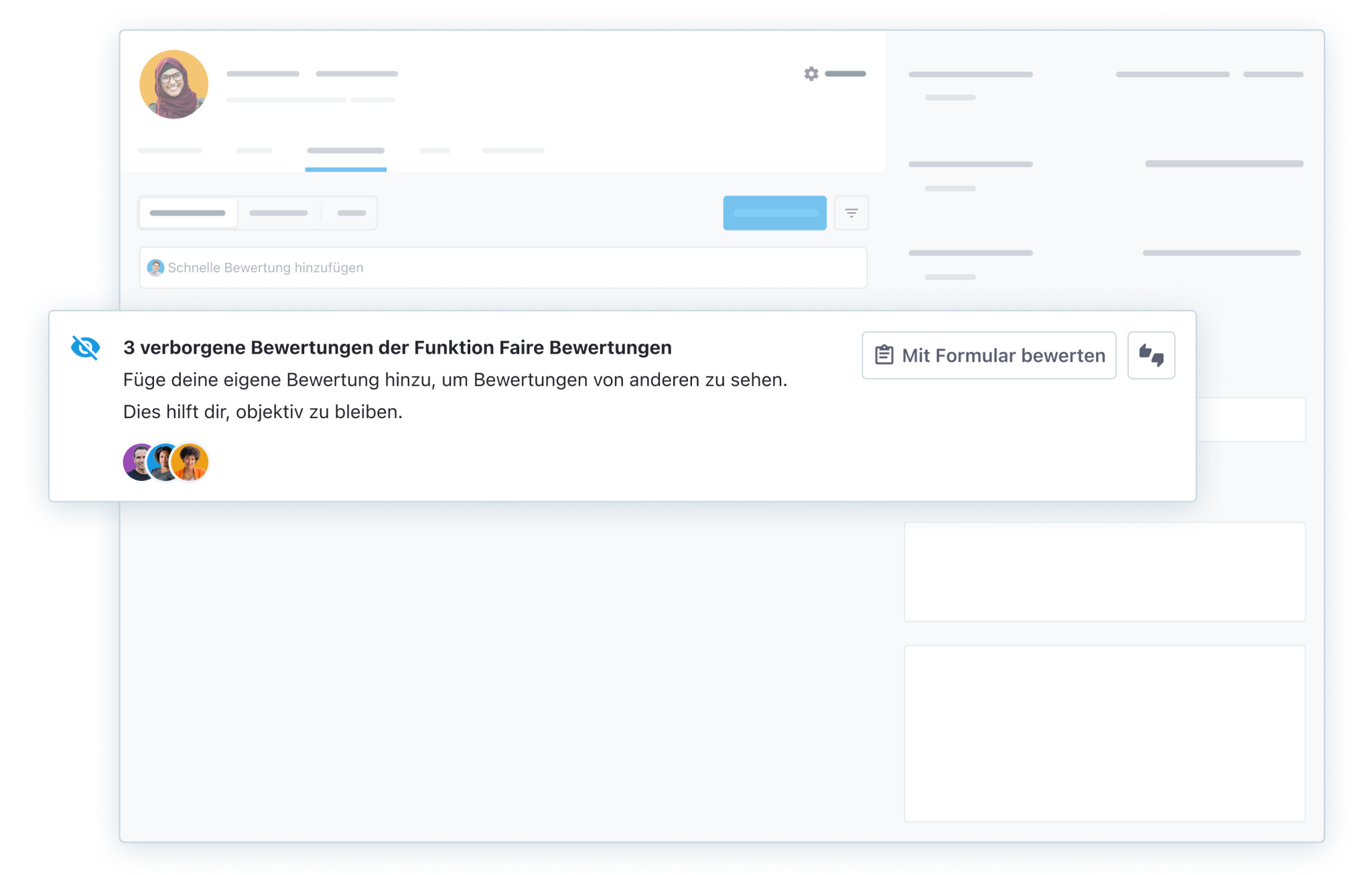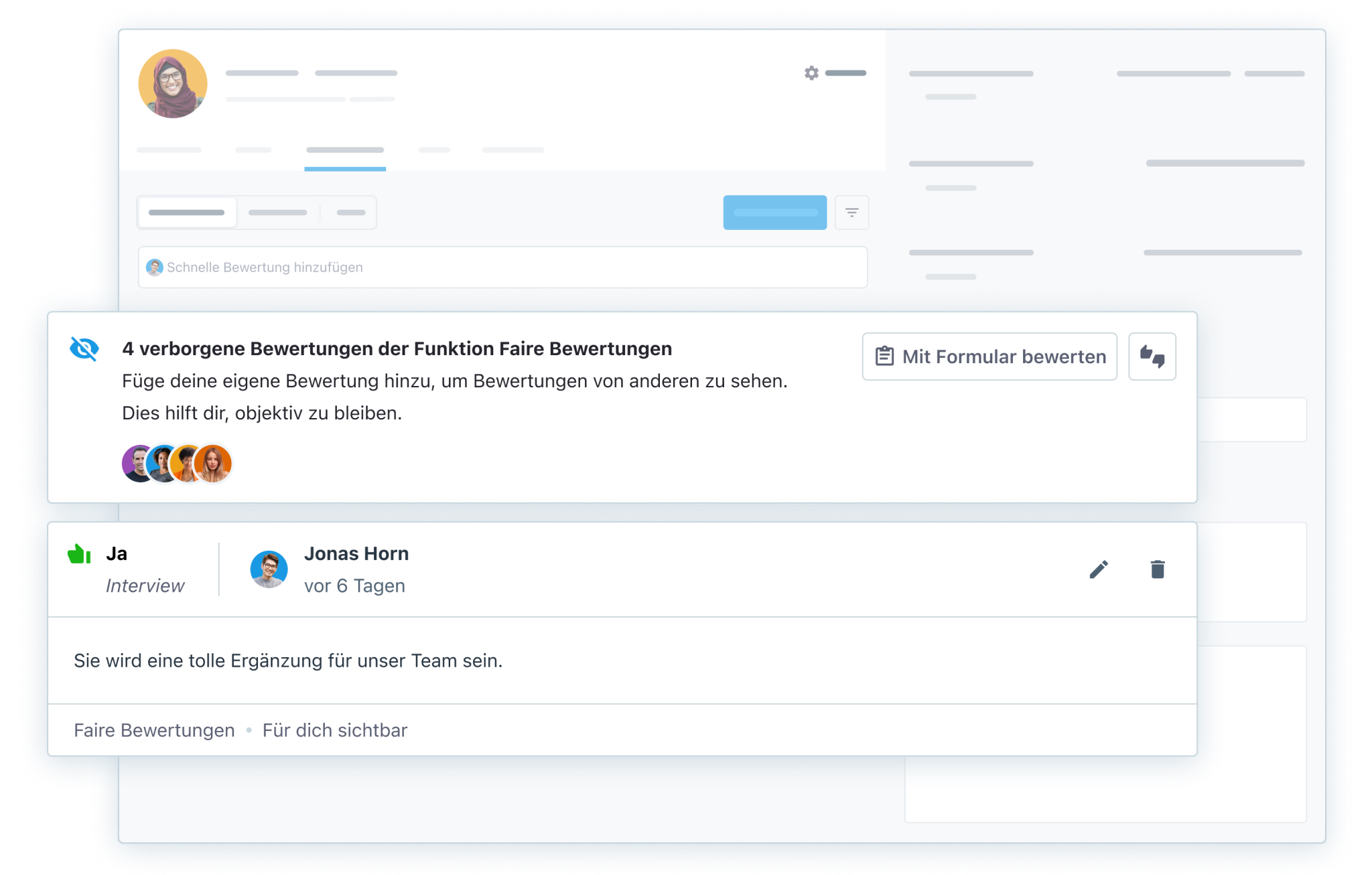 Da sich die Mitglieder eines Recruiting-Teams gegenseitig in ihrem Eindruck von einem*einer Kandidat*in beeinflussen können, können Sie mit dieser Funktion Bewertungen vorübergehend ausblenden. Die Bewertungen Ihres Teams bleiben verborgen, bis Sie Ihr eigenes Feedback hinzufügen.