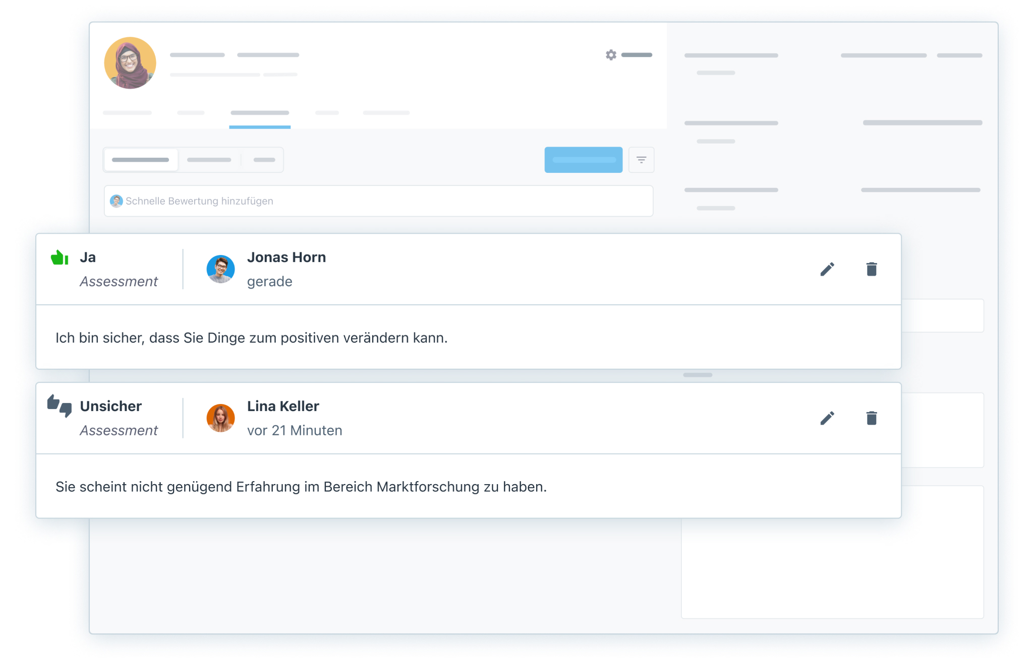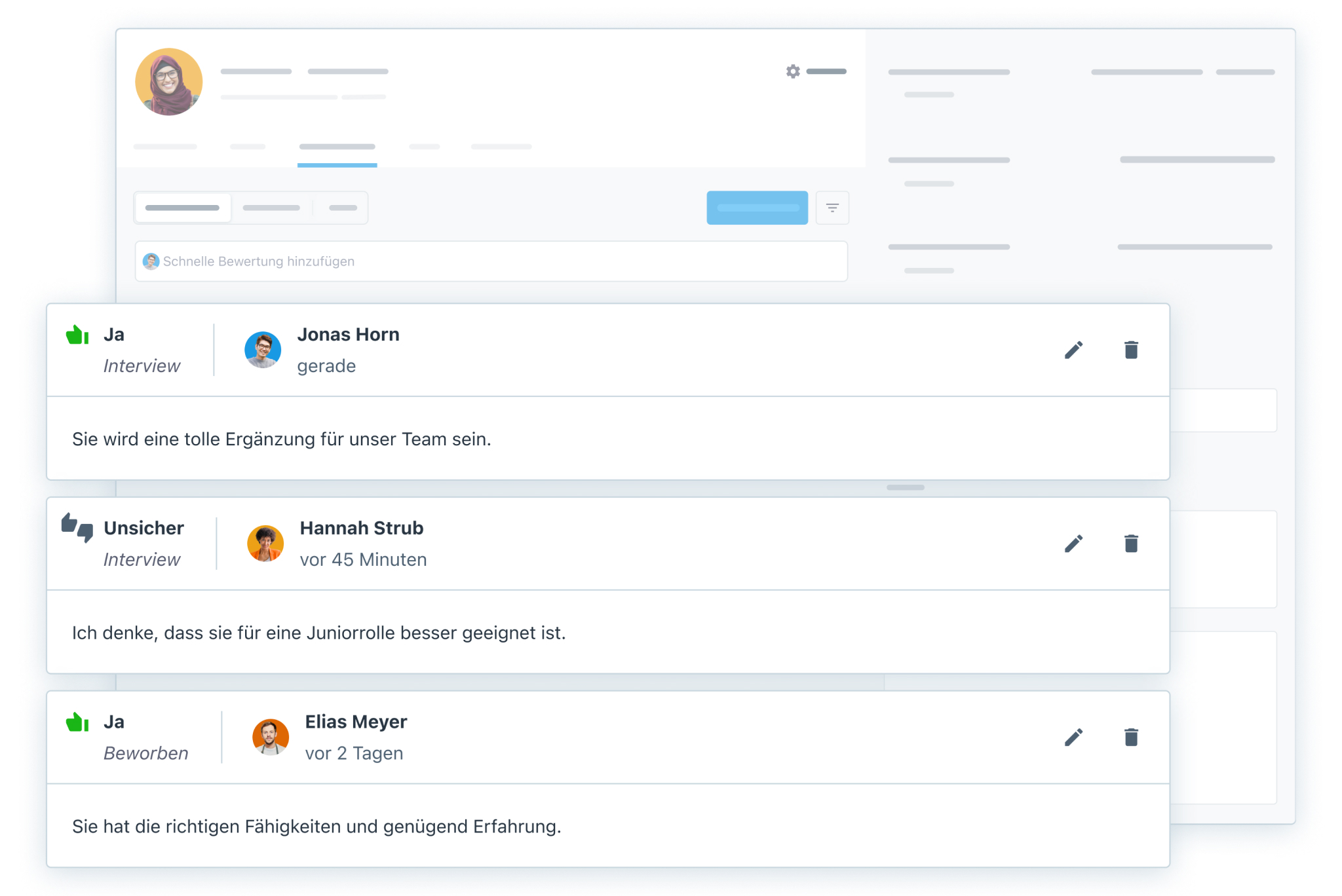 Die Funktion gibt allen Beteiligten eine faire Chance, Kandidat*innen zu bewerten, auch wenn sie nur an einer Phase der Einstellung beteiligt sind.