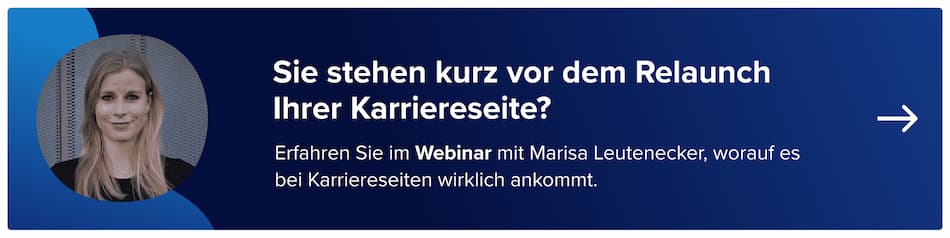 Machen Sie sich klar, dass jede*r Besucher*in ein*e potenzielle*r Bewerber*in ist. Manch eine*r hatte Ihr Unternehmen vielleicht noch gar nicht als mögliche*n Arbeitgeber*in wahrgenommen oder ist nicht aktiv auf Jobsuche. Integriere*n Sie den Verweis auf Ihre Karriereseite daher prominent, um einen Denkanstoß für alle Besucher*innen Ihrer Seite zu geben.