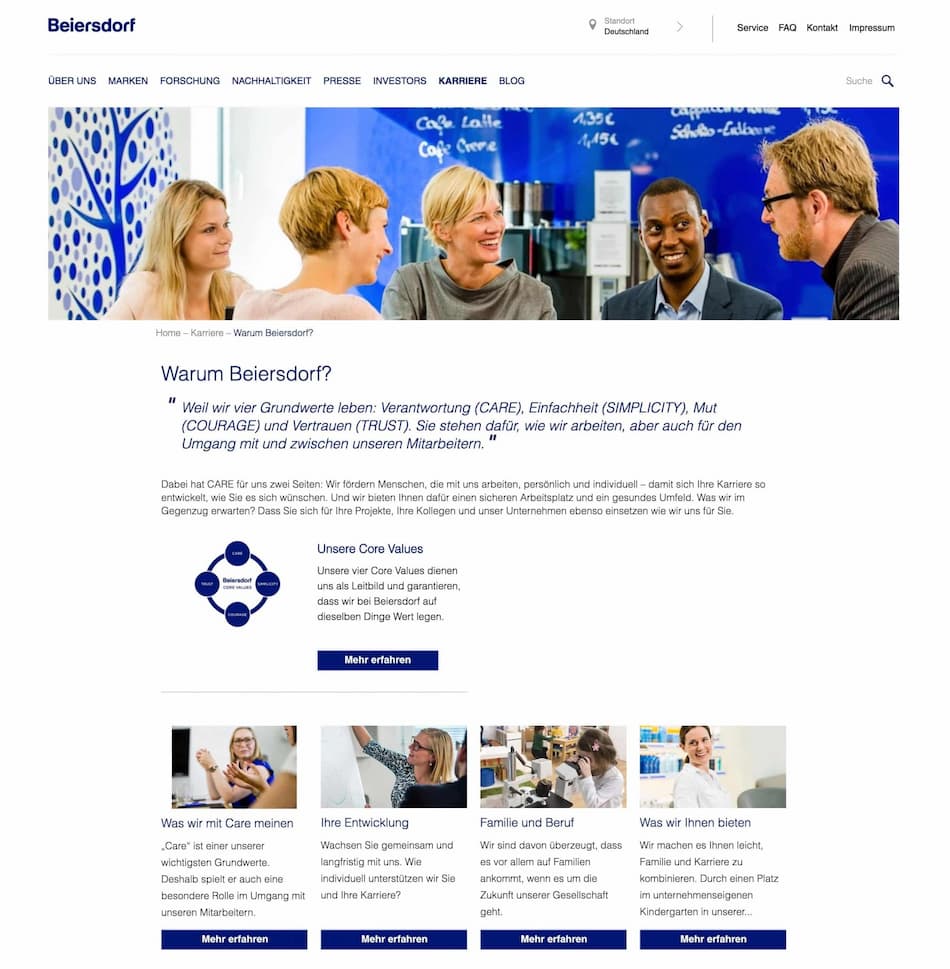 Beiersdorf beschreibt zum Beispiel im Detail seine Core Values und wie diese sich auf die Unternehmenskultur auswirken. Auf verschiedenen Unterseiten können sich Interessierte einen umfassenden Eindruck davon machen, welche Werte Beiersdorf hat, welche Entwicklungsmöglichkeiten es gibt und wie Familie und Beruf miteinander verbunden werden können.