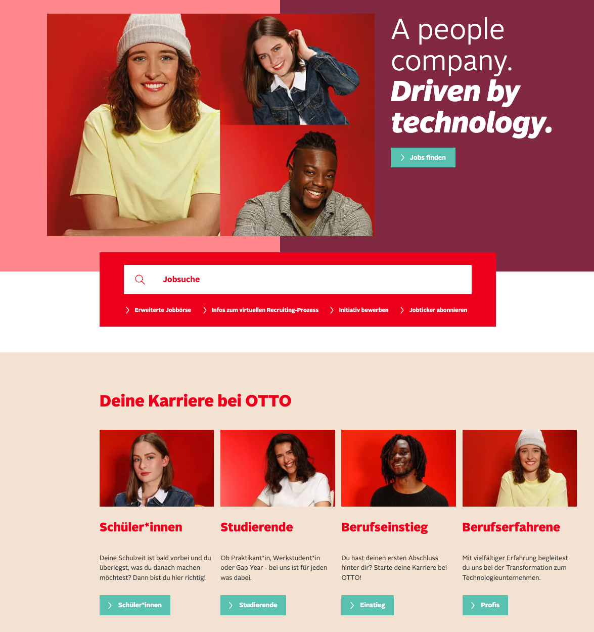 Auf der Karriereseite des Modeunternehmens Otto können Bewerber*innen zwischen den vier Bereichen Schüler*innen, Studierende, Berufseinsteiger*innen und Berufserfahrene wählen. Jeder Bereich ist individuell auf die jeweilige Zielgruppe angepasst und ermöglicht so die gezielte Ansprache der Interessent*innen.