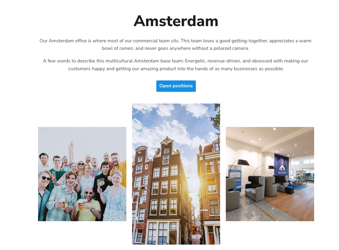 Idealerweise haben Sie den*die Bewerber*in dazu gebracht, weiter nach unten auf Ihrer Karriereseite zu scrollen. Hier sollten Sie die eben vermittelte Botschaft greifbar machen. Haben Sie z. B. von einem tollen Team gesprochen, sollten Sie auch ein echtes Teamfoto präsentieren und nicht auf Stock-Fotos zurückgreifen. Zeigen Sie Persönlichkeit – ein erster Schritt zu einem erfolgreichen Employer Branding!
