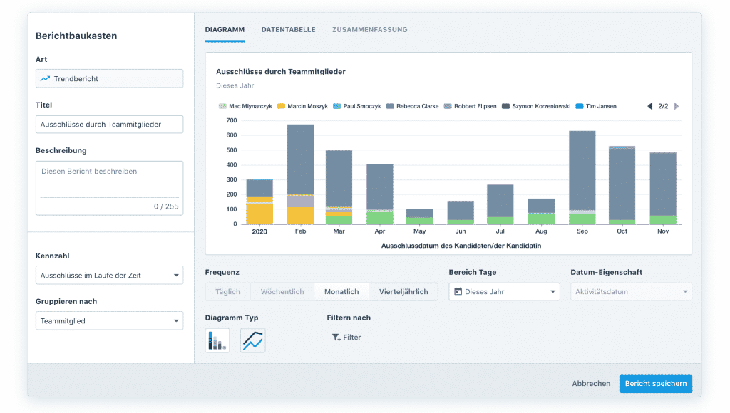 Mit Trendberichten in Recruitee können Sie Änderungen Ihrer Daten im Laufe eines Monats, einer Woche usw. anzeigen.[/caption]