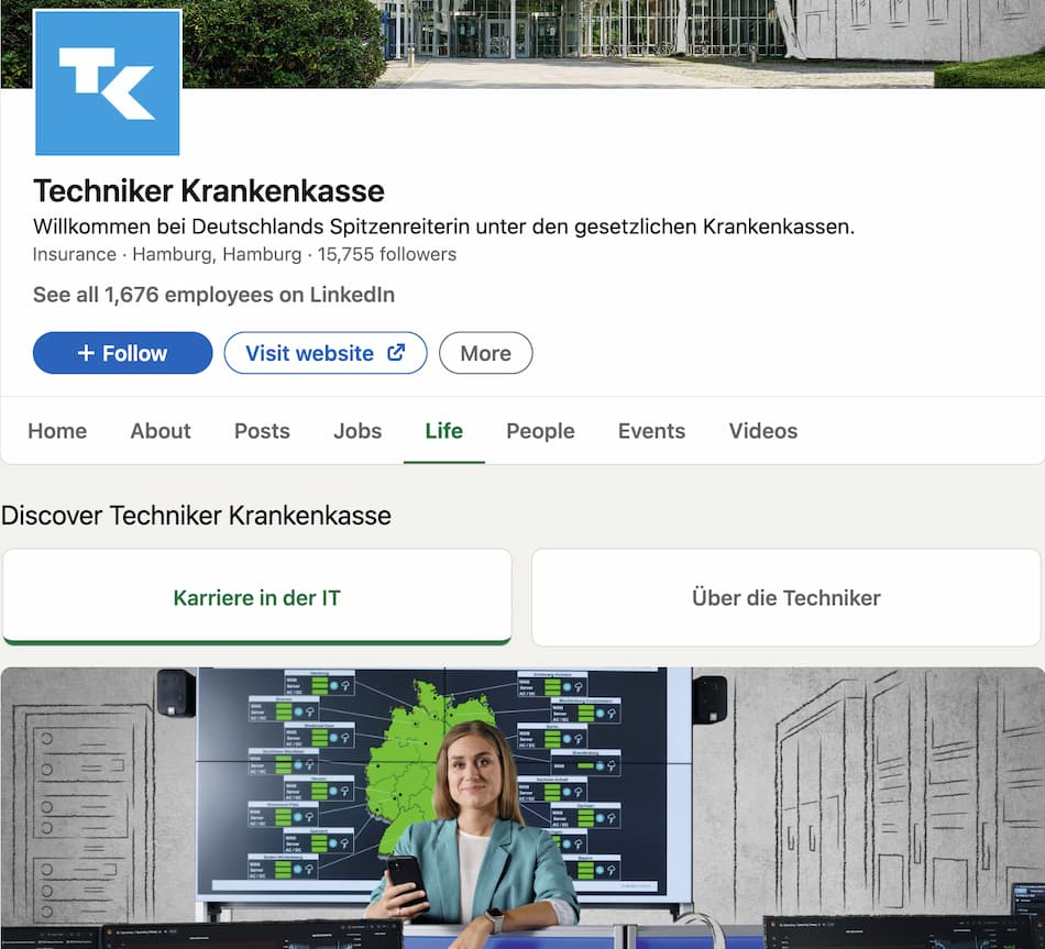 Auf der separaten Life-Sektion des LinkedIn Profils der Techniker Krankenkasse, präsentiert sich das Unternehmen vor allem für Jobsuchende. Man kann schon fast sagen, dass die TK hier eine Mini-Karriereseite aufgebaut hat. Man findet hier nicht nur jede Menge Infos und Videos, sondern auch jede Menge Links zur eigentlichen Website des Unternehmens. So präsentiert sich das Unternehmen nicht nur für LinkedIn-User*innen, sondern generiert auch wertvollen Traffic auf die Karriereseite des Unternehmens.