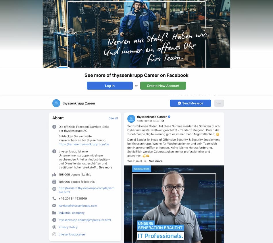 Facebook kann hervorragend für Recruiting-Kampagnen mit einer eigenen Seite eingesetzt werden. Thyssen Krupp hat beispielsweise eine eigene Karriere-Facebookseite. Hier teilt das Unternehmen Content, der 100% auf die Employer Brand fokussiert ist. Mit fast 200.000 Followern scheint das Konzept erfolgreich aufgegangen zu sein.