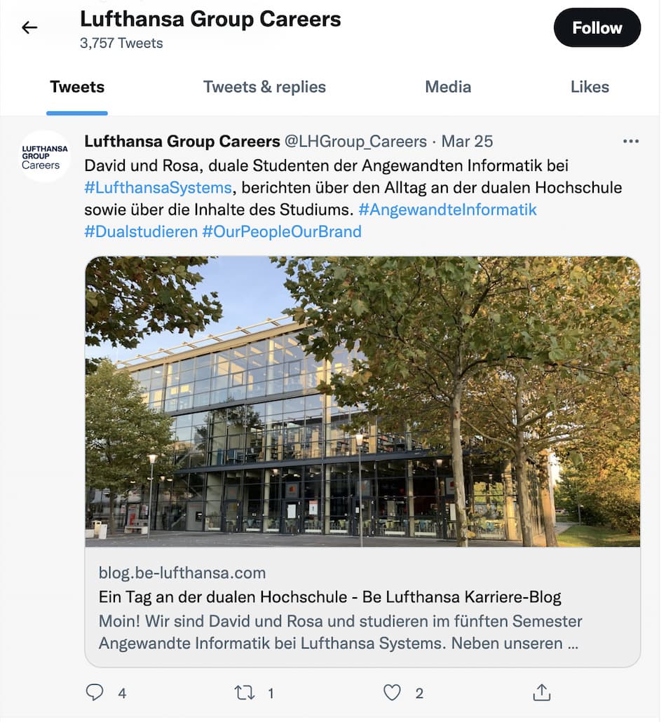 Es gibt aber auch Unternehmen, die zeigen, dass Twitter durchaus als Employer Branding Kanal genutzt werden kann. So teilt die Lufthansa über ihren Lufthansa Group Careers Twitter Account regelmäßig Einblicke in die Projekte der Azubis und dualen Student*innen.