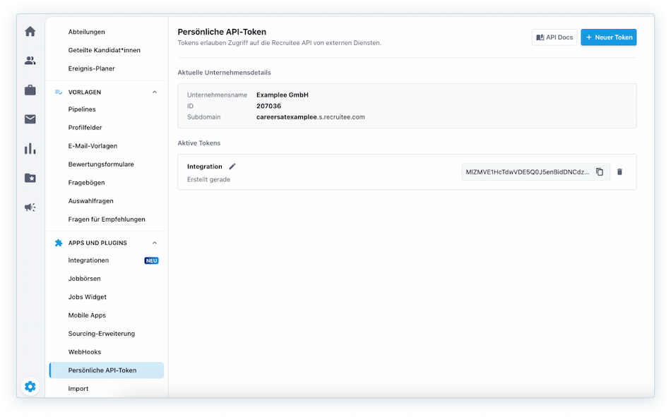 Ein API-Token, auch bekannt als Zugangs-Token, funktioniert wie ein Passwort. Um eine verfügbare Lösung eines Drittanbieters in Recruitee zu integrieren, können Sie auf Einstellungen > Apps und Plugins > Persönliche API-Token gehen, um Ihre Recruitee Unternehmens-ID und Ihre Subdomain zu finden. Klicken Sie dann oben rechts auf "+ Neues Token", um ein persönliches API-Token zu generieren.