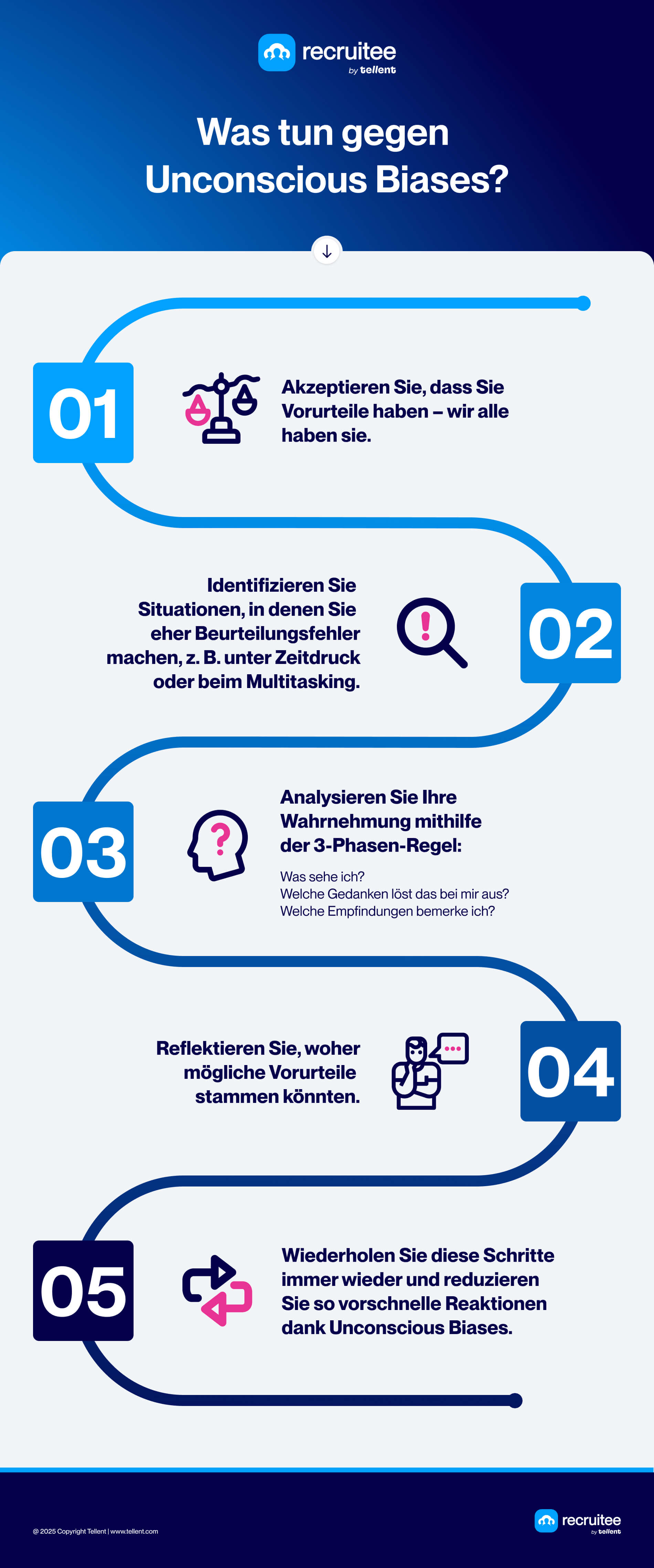 Diverse Teams sind nicht nur produktiver, sondern machen Unternehmen auch attraktiver für Bewerbende. Es lohnt sich also, Vielfalt am Arbeitsplatz aktiv zu fördern – und das beginnt schon beim Recruiting. Um Unconscious Biases zu minimieren, muss der Recruiting-Prozess entsprechend gestaltet werden. Hier sind konkrete Schritte, um dies zu erreichen: