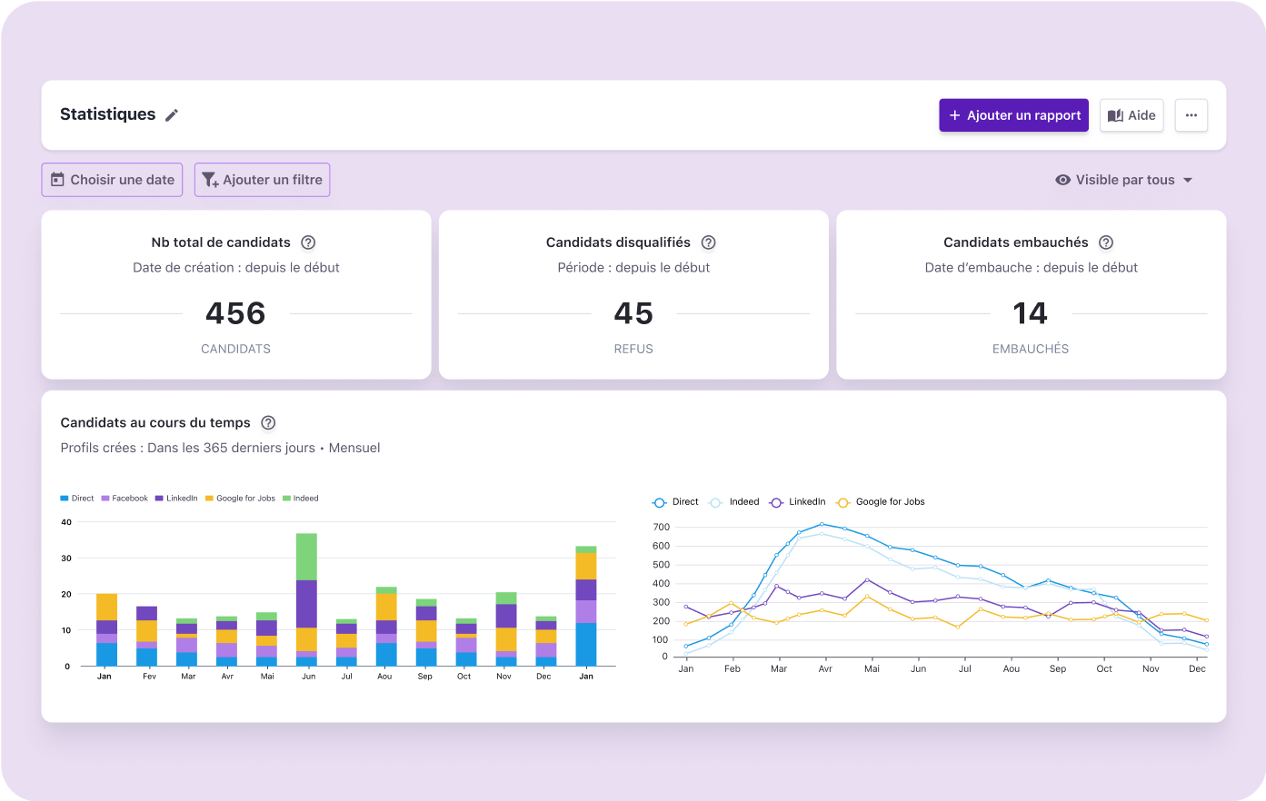 En un coup d’œil, ce dashboard vous permettra de concevoir des tableaux de bord et rapports personnalisés pour suivre les progrès de votre recrutement et les partager avec votre équipe, de suivre en temps réel les performances de votre process, de repérer les tendances et de prendre des décisions éclairées pour optimiser votre recrutement.