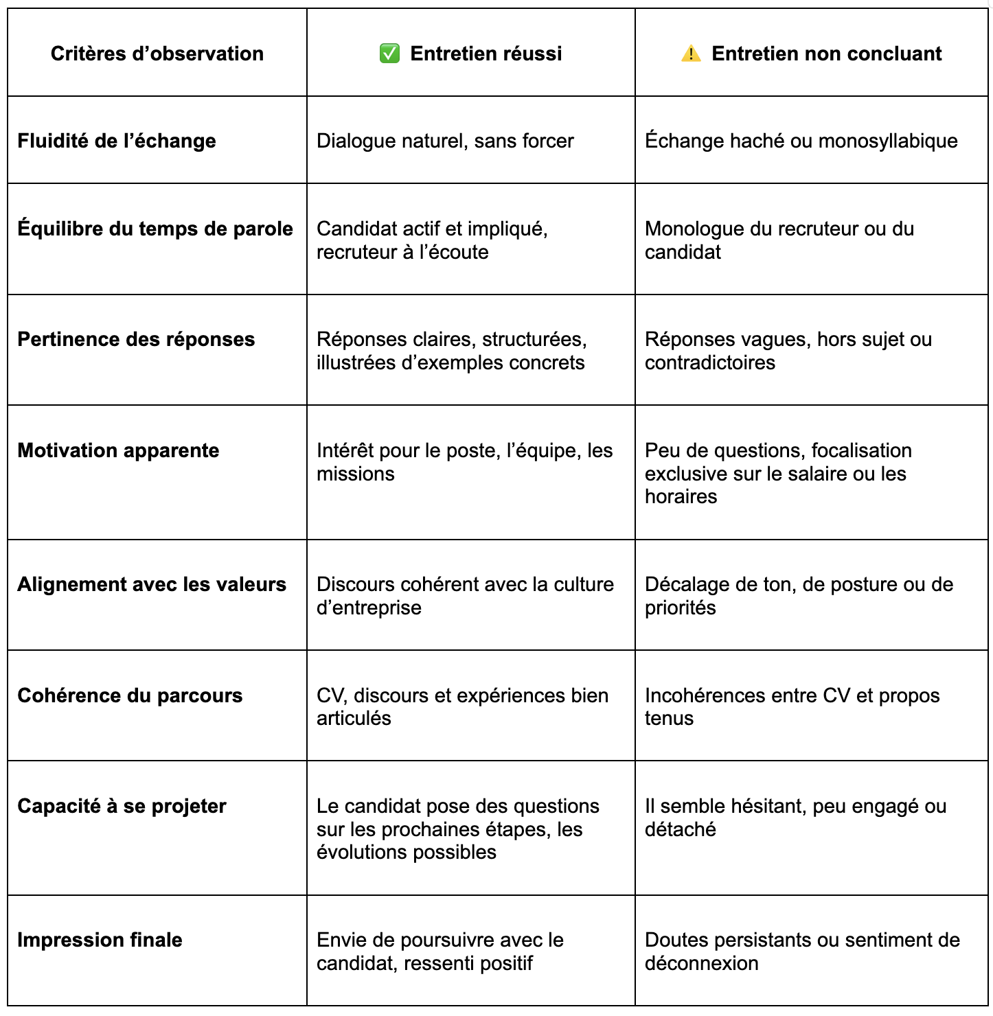 Voici un tableau comparatif des signes qu’un entretien est réussi ou non :