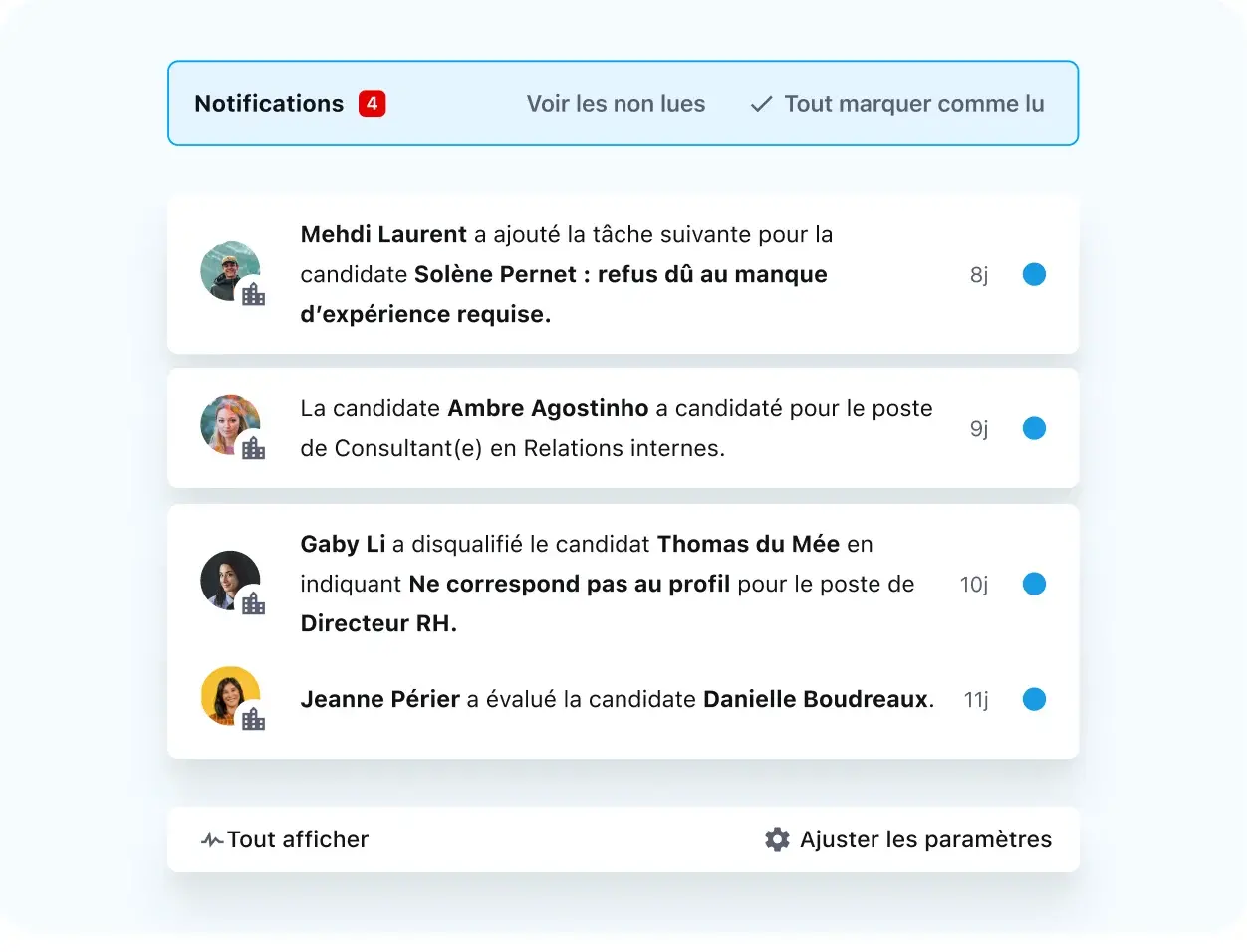 Oui, vous pouvez personnaliser un ATS pour qu’il réponde aux besoins de votre entreprise. Partagez l’accès à certaines fonctionnalités avec d’autres membres de votre équipe, personnalisez les tableaux de bord et intégrez les outils de votre choix pour créer votre logiciel de recrutement idéal.
