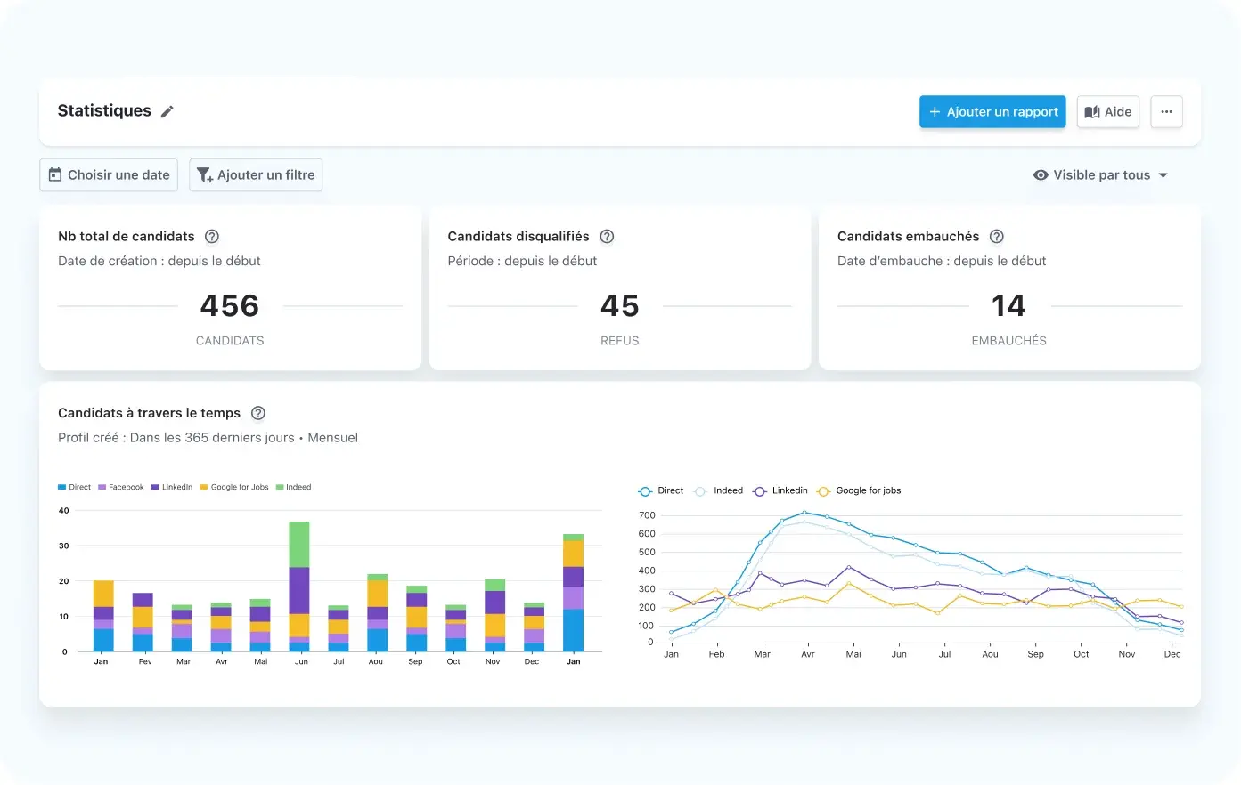 Avec un ATS, toutes vos données de recrutement sont compilées dans des tableaux de bord préconfigurés et entièrement personnalisables. Vous pouvez ainsi consulter facilement le nombre de postes ouverts, de candidatures reçues ou d’entretiens réalisés, et télécharger des rapports clairs qui ne manqueront pas d’épater vos collègues en réunion. À vous d’en tirer des leçons et de vous servir de ces informations pour améliorer vos stratégies de recrutement.
