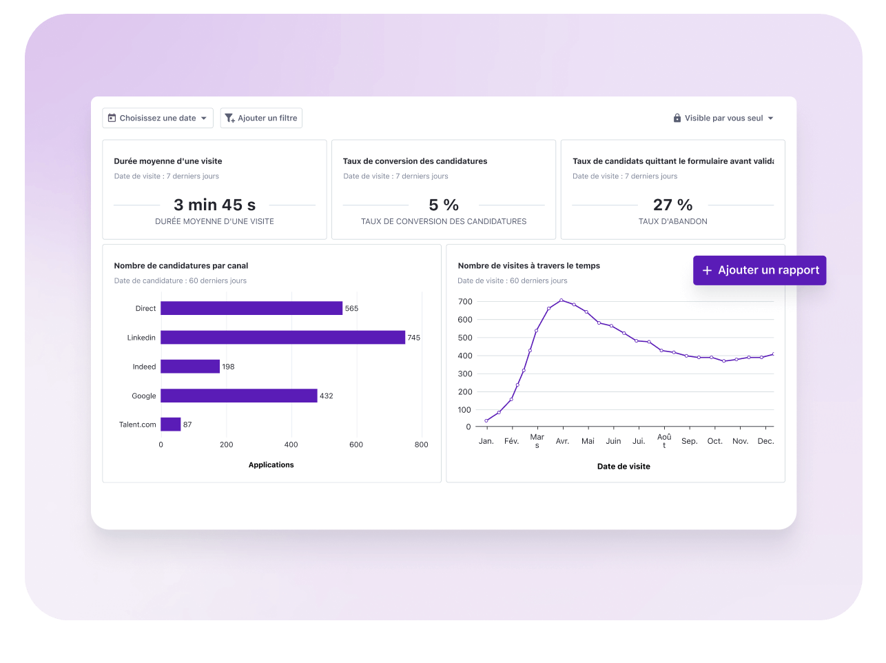 Trafic : nombre de visites, sources (job boards, LinkedIn, SEO, site corporate)