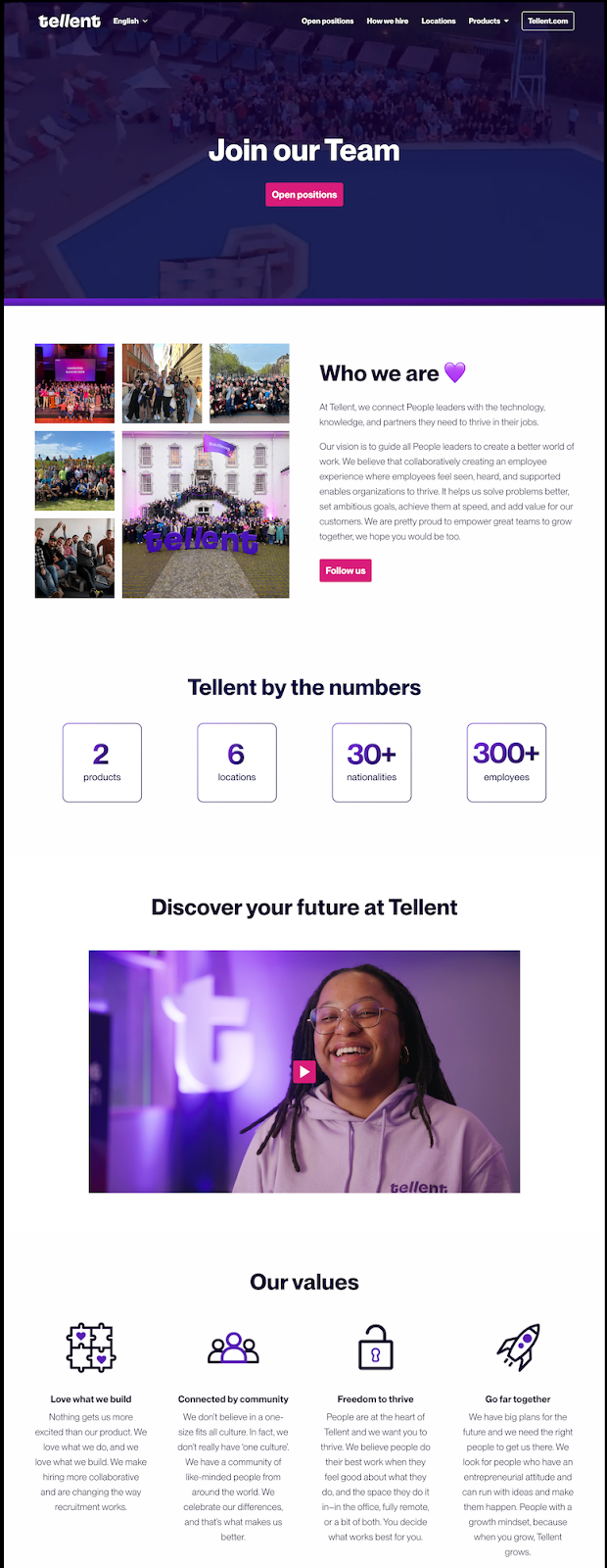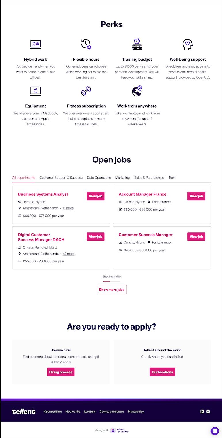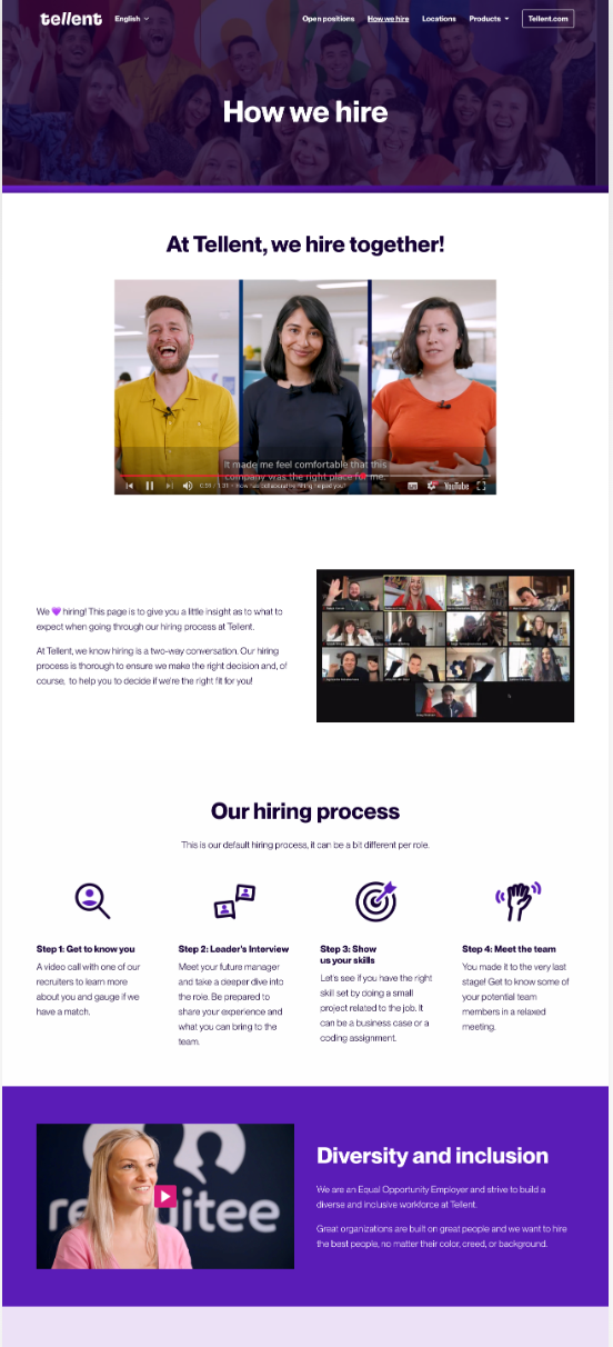 Gardez en tête qu’un site carrière doit être simple, intuitif et orienté utilisateur. Voici une structure de base à personnaliser selon vos besoins avec des exemples issus de notre site carrière Tellent Recruitee. On 💜 recruter et ça se voit :